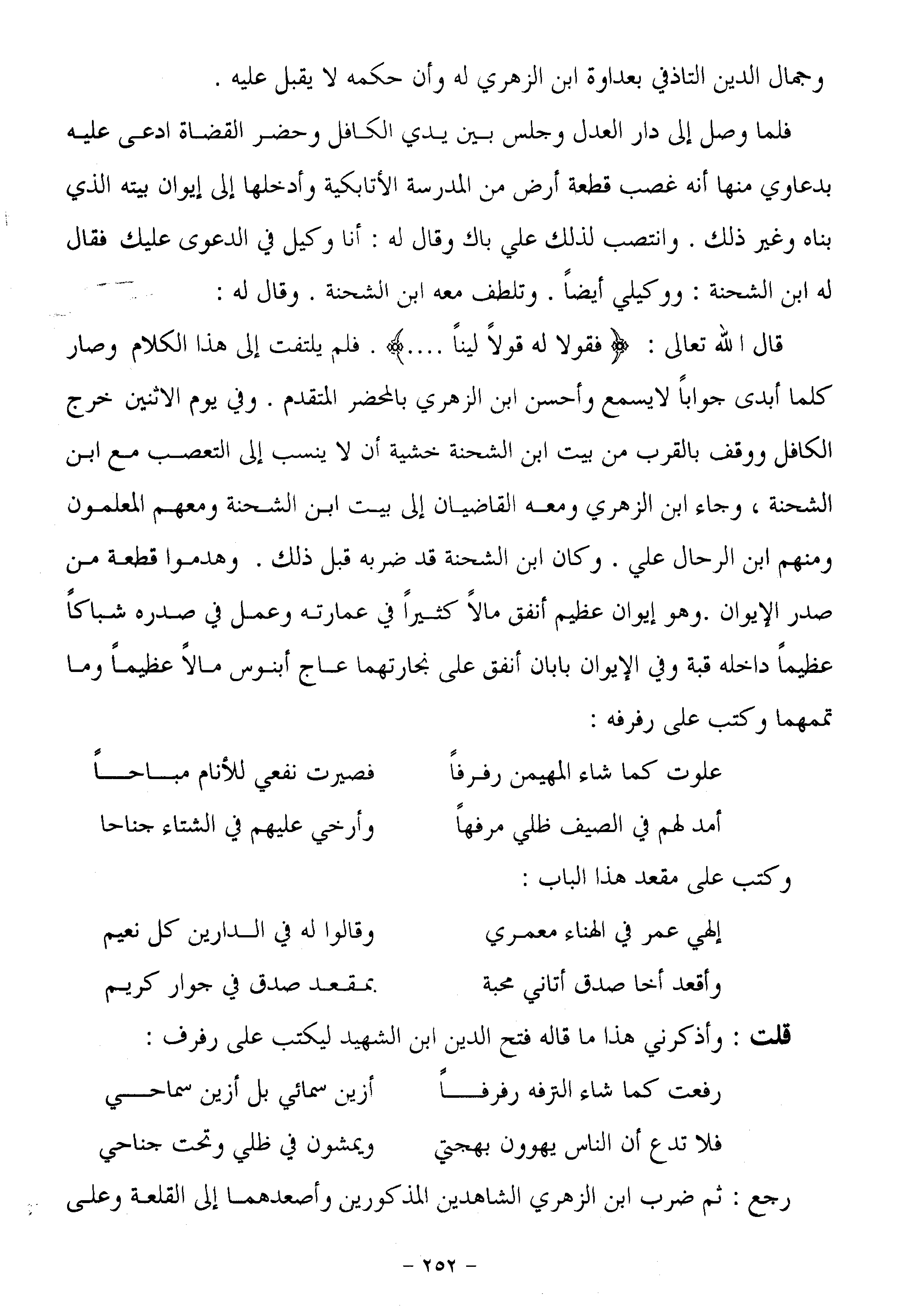 . فلم يلتفت إلى هذا الكلام وصار كلما أبدى جوابا لا يسمع وأحسن ابن الزهري بالمحضر المتقدم. وفي يوم الاثنين خرج الكافل ووقف بالقرب من بيت ابن الشحنة خشية أن لا ينسب إلى التعصب مع ابن الشحنة، وجاء ابن الزهري ومعه القاضيان إلى بيت ابن الشحنة ومعهم المعلمون ومنهم ابن الرحال علي. وكان ابن الشحنة قد ضربه قبل ذلك. وهدموا قطعة من صدر الإيوان. وهو إيوان عظيم أنفق مالا كثيرا في عمارته وعمل في صدره شباكا عظيما داخله قبة وفي الإيوان بابان أنفق على نجارتهما عاج أبنوس مالا عظيما وما تممهما وكتب على رفرفه: