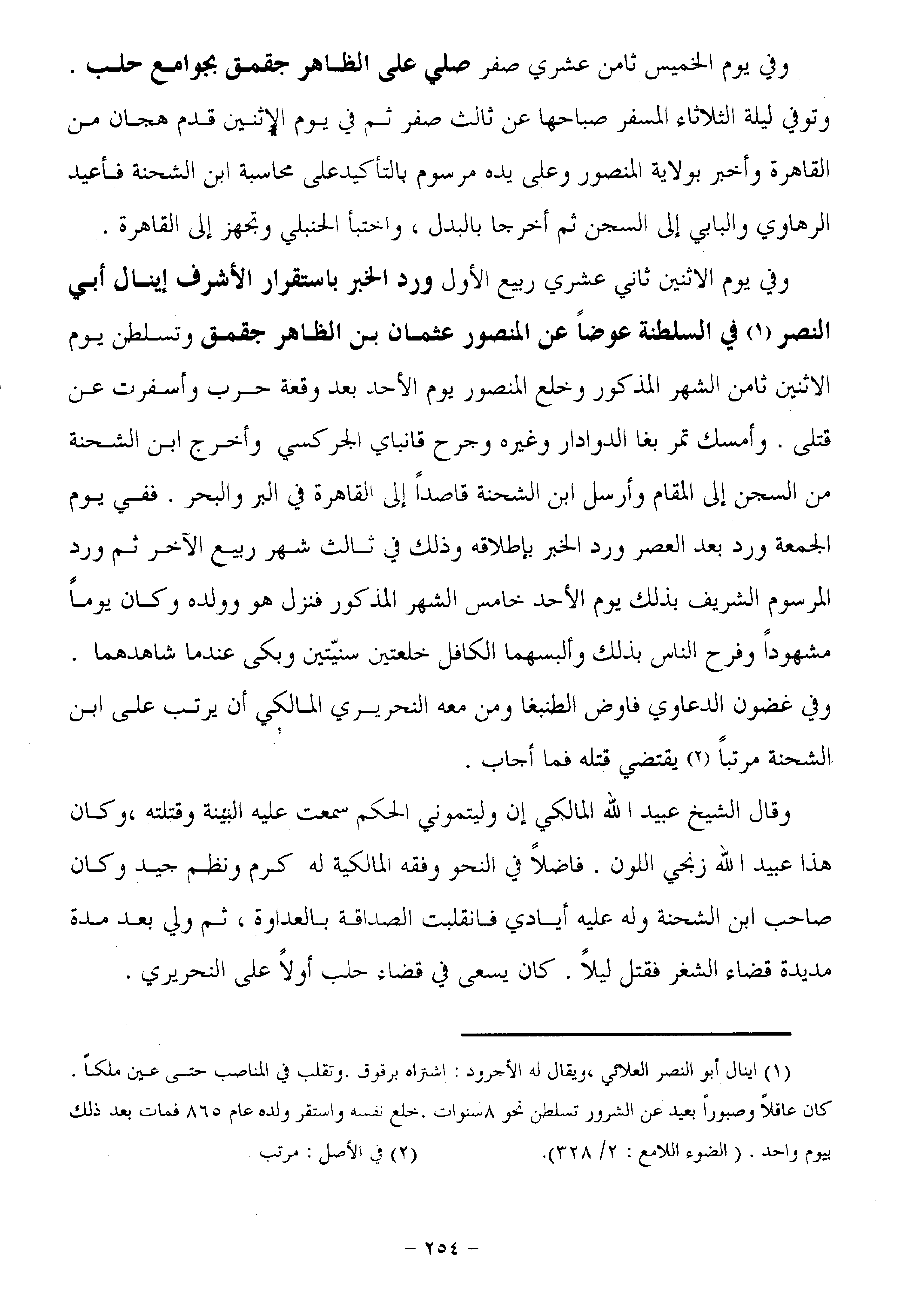 وفي يوم الاثنين ثاني عشري ربيع الأول ورد الخبر باستقرار الأشرف إينال أبي النصر «1» في السلطنة عوضا عن المنصور عثمان بن الظاهر جقمق وتسلطن يوم الاثنين ثامن الشهر المذكور وخلع المنصور يوم الأحد بعد وقعة حرب وأسفرت عن قتلى. وأمسك تمر بغا الدوادار وغيره وجرح قانباي الجركسي وأخرج ابن الشحنة من السجن إلى المقام وأرسل ابن الشحنة قاصدا إلى القاهرة في البر والبحر. ففي يوم الجمعة ورد بعد العصر ورد الخبر بإطلاقه وذلك في ثالث شهر ربيع الآخر ثم ورد المرسوم الشريف بذلك يوم الأحد خامس الشهر المذكور فنزل هو وولده وكان يوما مشهودا وفرح الناس بذلك وألبسهما الكافل خلعتين سنيّتين وبكى عندما شاهدهما.