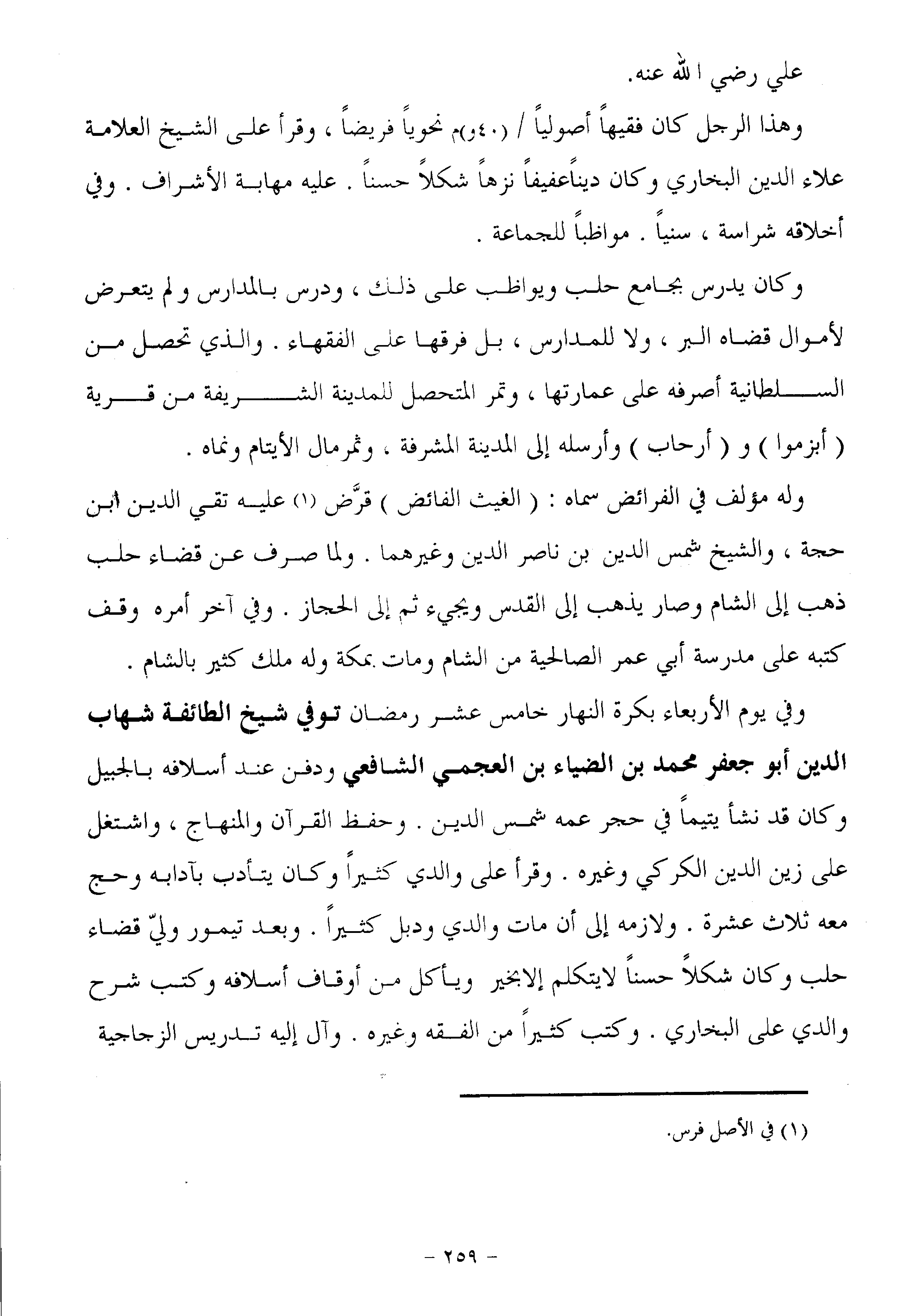 وهذا الرجل كان فقيها أصوليا/ (40 و) م نحويا فريضا، وقرأ على الشيخ العلامة علاء الدين البخاري وكان دينا عفيفا نزها شكلا حسنا. عليه مهابة الأشراف. وفي أخلاقه شراسة، سنيا. مواظبا للجماعة.