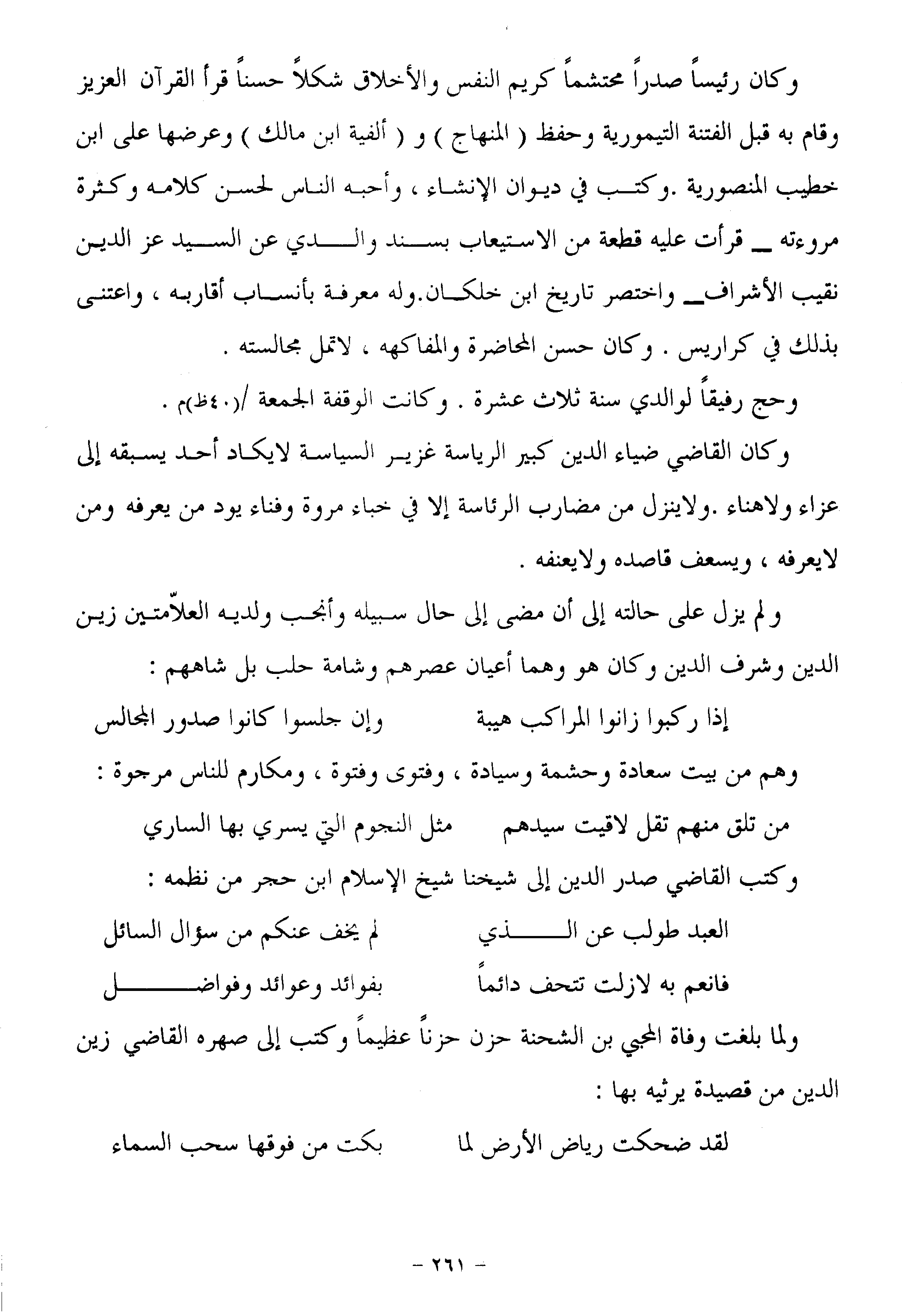 وكان رئيسا صدرا محتشما كريم النفس والأخلاق شكلا حسنا قرأ القرآن العزيز وقام به قبل الفتنة التيمورية وحفظ (المنهاج) و (ألفية ابن مالك) وعرضها على ابن خطيب المنصورية. وكتب في ديوان الإنشاء، وأحبه الناس لحسن كلامه وكثرة مروءته- قرأت عليه قطعة من الاستيعاب بسند والدي عن السيد عز الدين نقيب الأشراف- واختصر تاريخ ابن خلكان. وله معرفة بأنساب أقاربه، واعتنى بذلك في كراريس. وكان حسن المحاضرة والمفاكهه، لا تمل مجالسته.