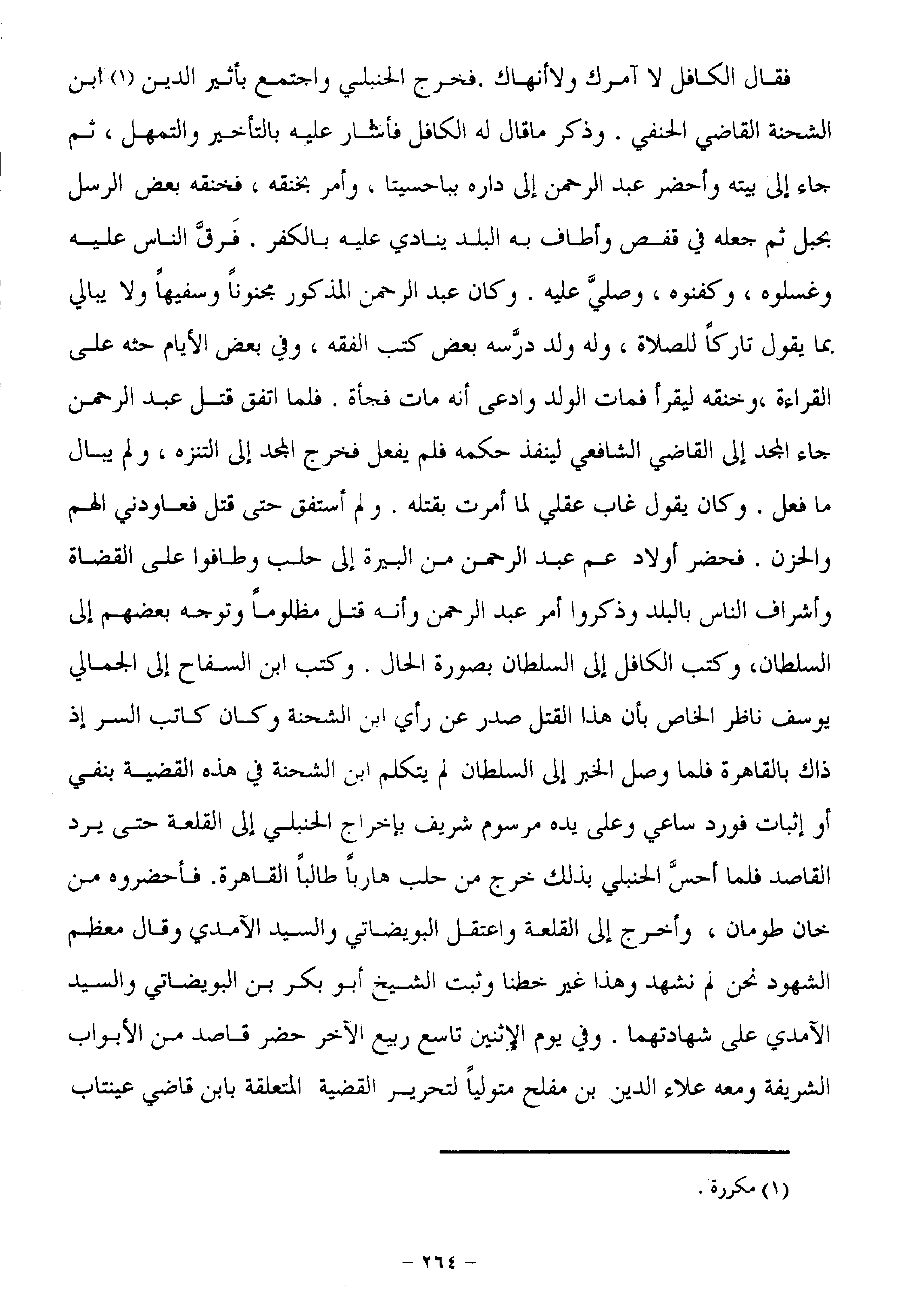 فقال الكافل لا آمرك ولا أنهاك. فخرج الحنبلي واجتمع بأثير الدين «1» ابن الشحنة القاضي الحنفي. وذكر ما قال له الكافل فأشار عليه بالتأخير والتمهل، ثم جاء إلى بيته وأحضر عبد الرحمن إلى داره ببا حسيتا، وأمر بخنقه، فخنقه بعض الرسل بحبل ثم جعله في قفص وأطاف به البلد ينادي عليه بالكفر. فرقّ الناس عليه وغسلوه، وكفنوه، وصليّ عليه. وكان عبد الرحمن المذكور مجنونا وسفيها ولا يبالي بما يقول تاركا للصلاة، وله ولد درّسه بعض كتب الفقه، وفي بعض الأيام حثه على القراءة، وخنقه ليقرأ فمات الولد وادعى أنه مات فجأة. فلما اتفق قتل عبد الرحمن جاء المجد إلى القاضي الشافعي لينفذ حكمه فلم يفعل فخرج المجد إلى التنزه، ولم يبال ما فعل. وكان يقول غاب عقلي لما أمرت بقتله. ولم أستفق حتى قتل فعاودني الهم والحزن. فحضر أولاد عم عبد الرحمن من البيرة إلى حلب وطافوا على القضاة وأشراف الناس بالبلد وذكروا أمر عبد الرحمن وأنه قتل مظلوما وتوجه بعضهم إلى السلطان، وكتب الكافل إلى السلطان بصورة الحال. وكتب ابن السفاح إلى الجمالي يوسف ناظر الخاص بأن هذا القتل صدر عن رأي ابن الشحنة وكان كاتب السر إذ ذاك بالقاهرة فلما وصل الخبر إلى السلطان لم يتكلم ابن الشحنة في هذه القضية بنفي أو إثبات فورد ساعي وعلى يده مرسوم شريف بإخراج الحنبلي إلى القلعة حتى يرد القاصد فلما أحسّ الحنبلي بذلك خرج من حلب هاربا طالبا القاهرة. فأحضروه من خان طومان، وأخرج إلى القلعة واعتقل البويضاتي والسيد الآمدي وقال معظم الشهود نحن لم نشهد وهذا غير خطنا وثبت الشيخ أبو بكر بن البويضاتي والسيد الآمدي على شهادتهما. وفي يوم الاثنين تاسع ربيع الآخر حضر قاصد من الأبواب الشريفة ومعه علاء الدين بن مفلح متوليا لتحرير القضية المتعلقة بابن قاضي عينتاب