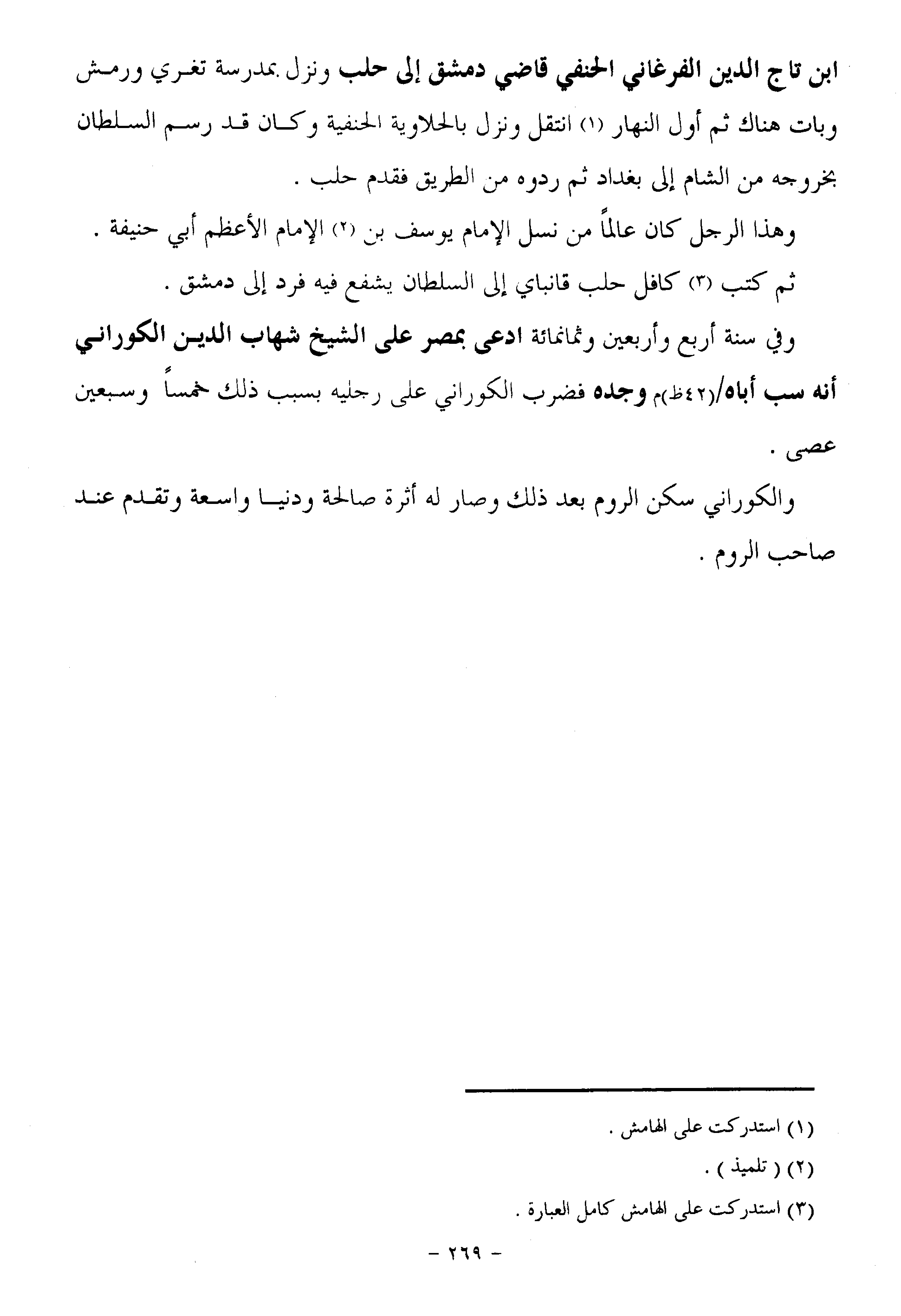 ابن تاج الدين الفرغاني الحنفي قاضي دمشق إلى حلب ونزل بمدرسة تغري ورمش وبات هناك ثم أول النهار «1» انتقل ونزل بالحلاوية الحنفية وكان قد رسم السلطان بخروجه من الشام إلى بغداد ثم ردوه من الطريق فقدم حلب.