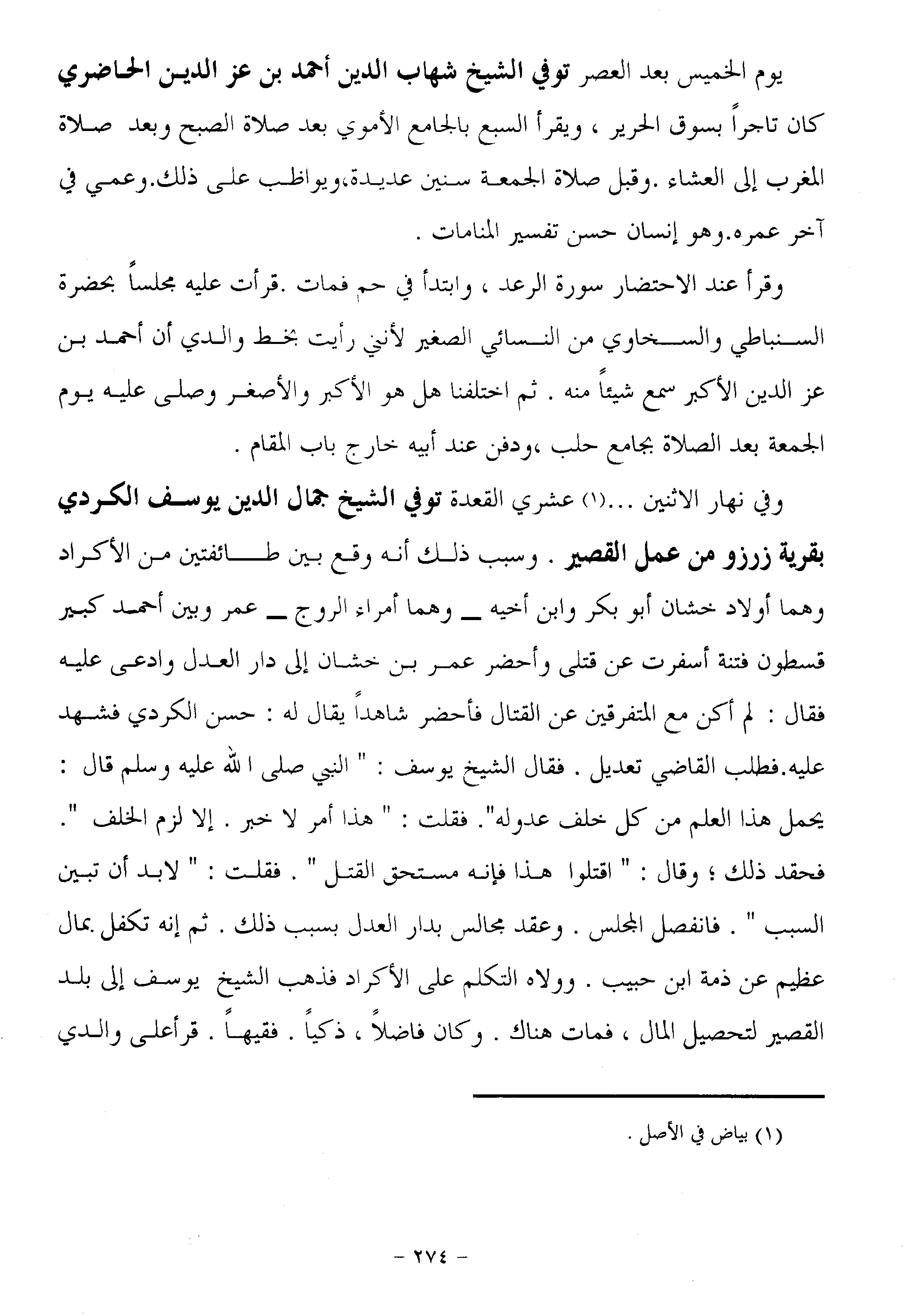 وفي نهار الاثنين ... «1» عشري القعدة توفي الشيخ جمال الدين يوسف الكردي بقرية زرزو من عمل القصير. وسبب ذلك أنه وقع بين طائفتين من الأكراد وهما أولاد خشان أبو بكر وابن أخيه- وهما أمراء الروج- عمر وبين أحمد كبير قسطون فتنة أسفرت عن قتلى وأحضر عمر بن خشان إلى دار العدل وادعى عليه فقال: لم أكن مع المتفرقين عن القتال فأحضر شاهدا يقال له: حسن الكردي فشهد عليه. فطلب القاضي تعديل. فقال الشيخ يوسف:" النبي صلى الله عليه وسلم قال: