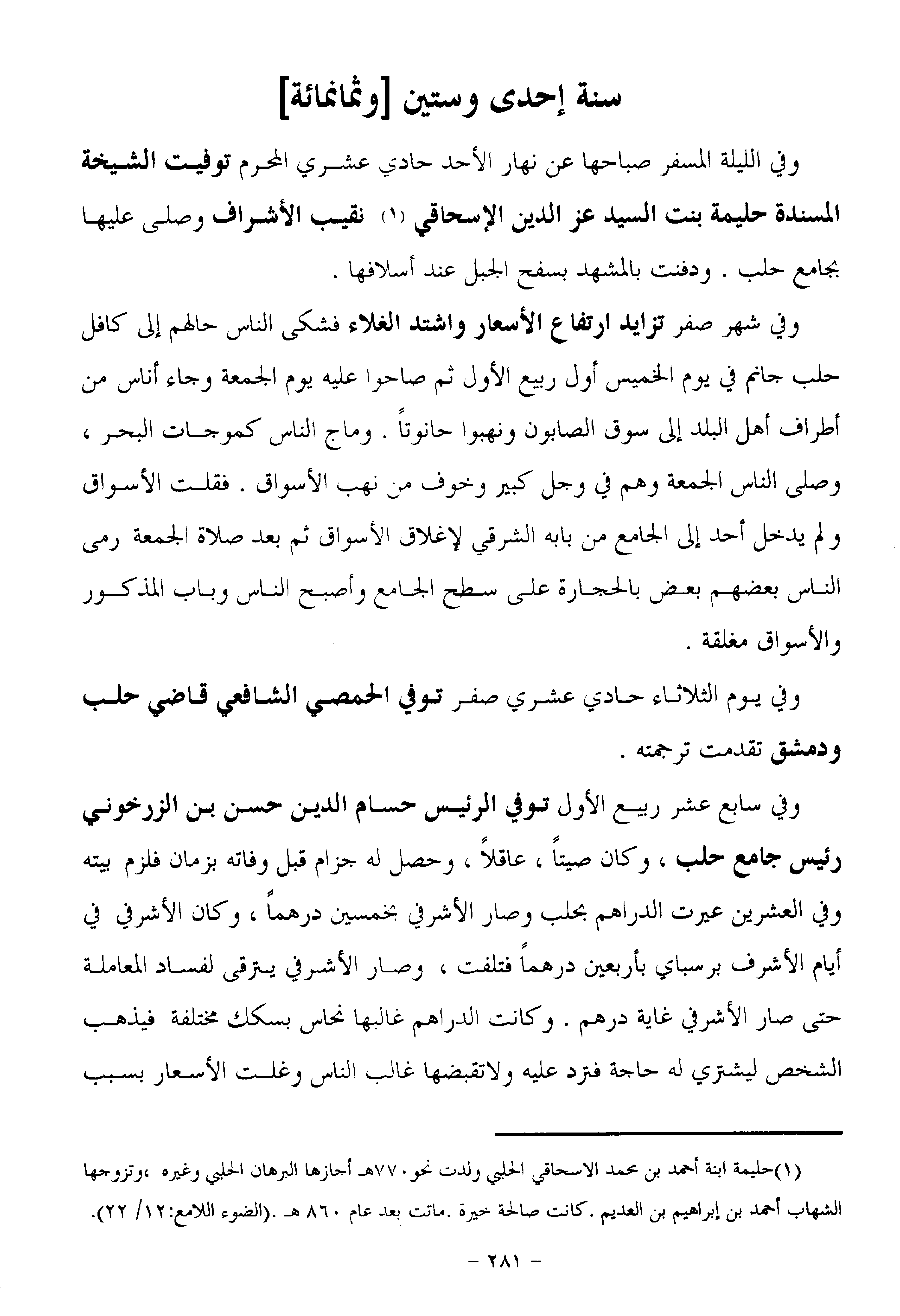 وفي الليلة المسفر صباحها عن نهار الأحد حادي عشري المحرم توفيت الشيخة المسندة حليمة بنت السيد عز الدين الإسحاقي «1» نقيب الأشراف وصلى عليها بجامع حلب. ودفنت بالمشهد بسفح الجبل عند أسلافها.
