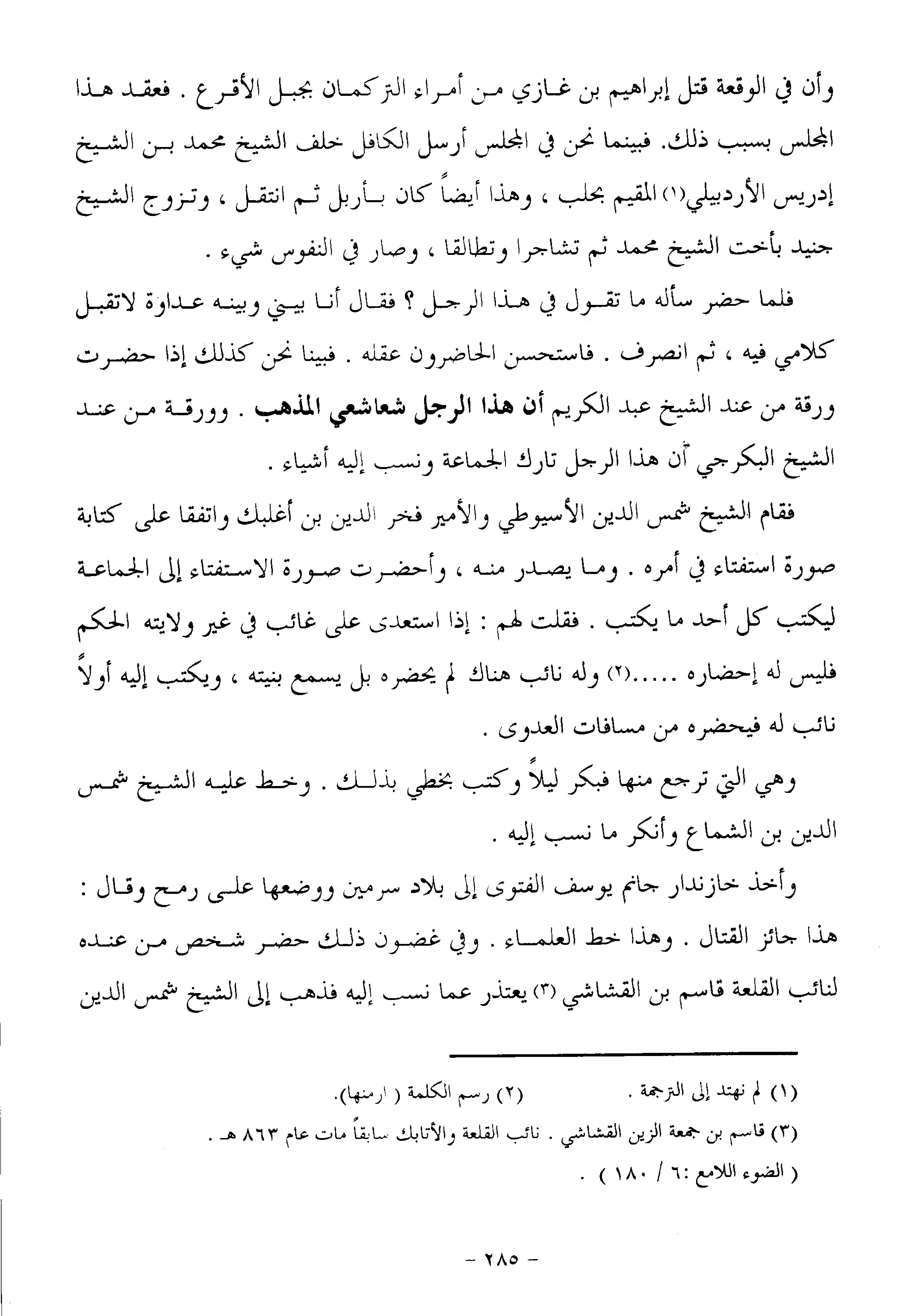 هذا جائز القتال. وهذا خط العلماء. وفي غضون ذلك حضر شخص من عنده لنائب القلعة قاسم بن القشاشي «3» يعتذر عما نسب إليه فذهب إلى الشيخ شمس الدين