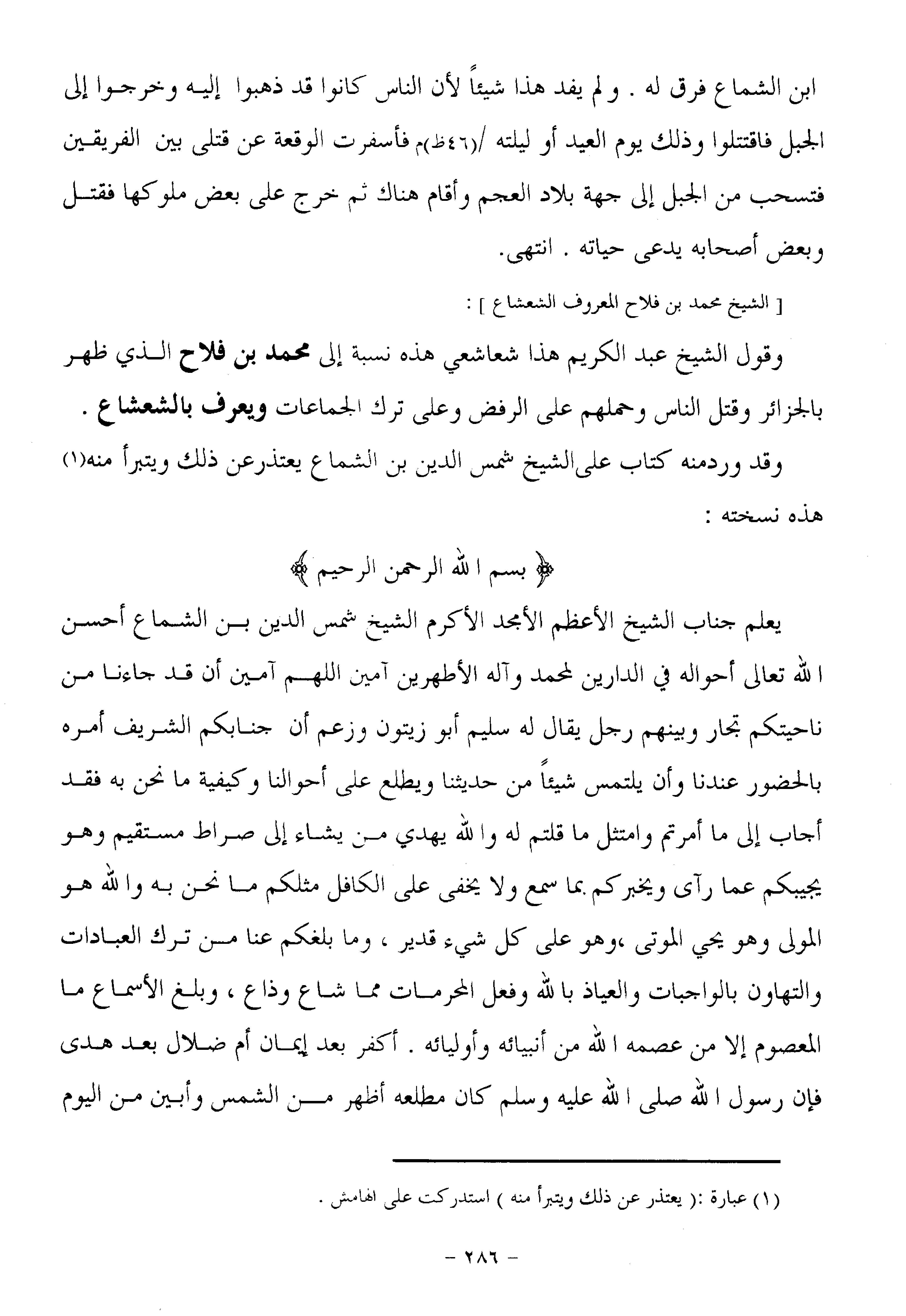 وقول الشيخ عبد الكريم هذا شعاشعي هذه نسبة إلى محمد بن فلاح الذي ظهر بالجزائر وقتل الناس وحملهم على الرفض وعلى ترك الجماعات ويعرف بالشعشاع.
