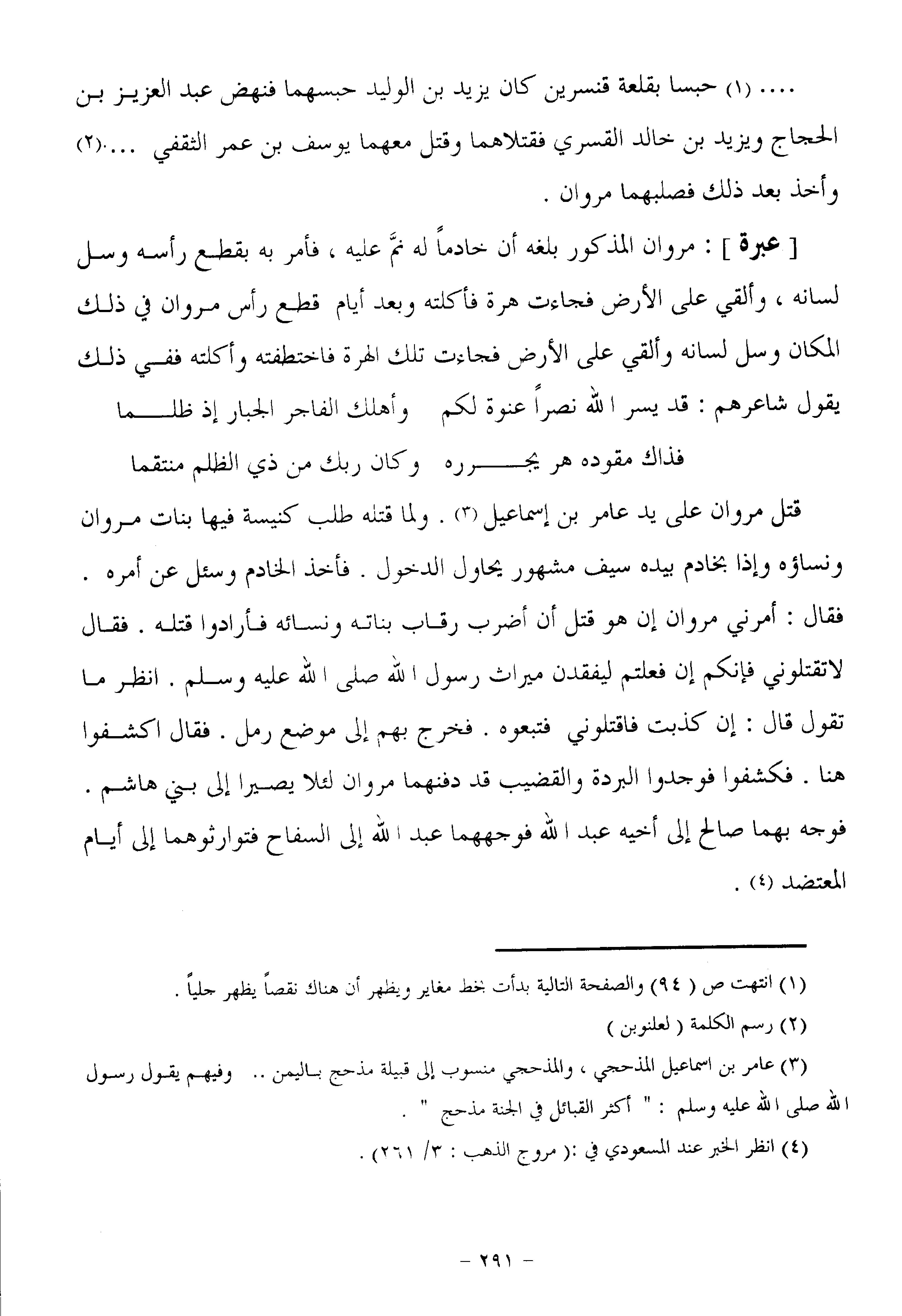 [عبرة] : مروان المذكور بلغه أن خادما له نمّ عليه، فأمر به بقطع رأسه وسل لسانه، وألقي على الأرض فجاءت هرة فأكلته وبعد أيام قطع رأس مروان في ذلك المكان وسل لسانه وألقي على الأرض فجاءت تلك الهرة فاختطفته وأكلته ففي ذلك يقول شاعرهم: