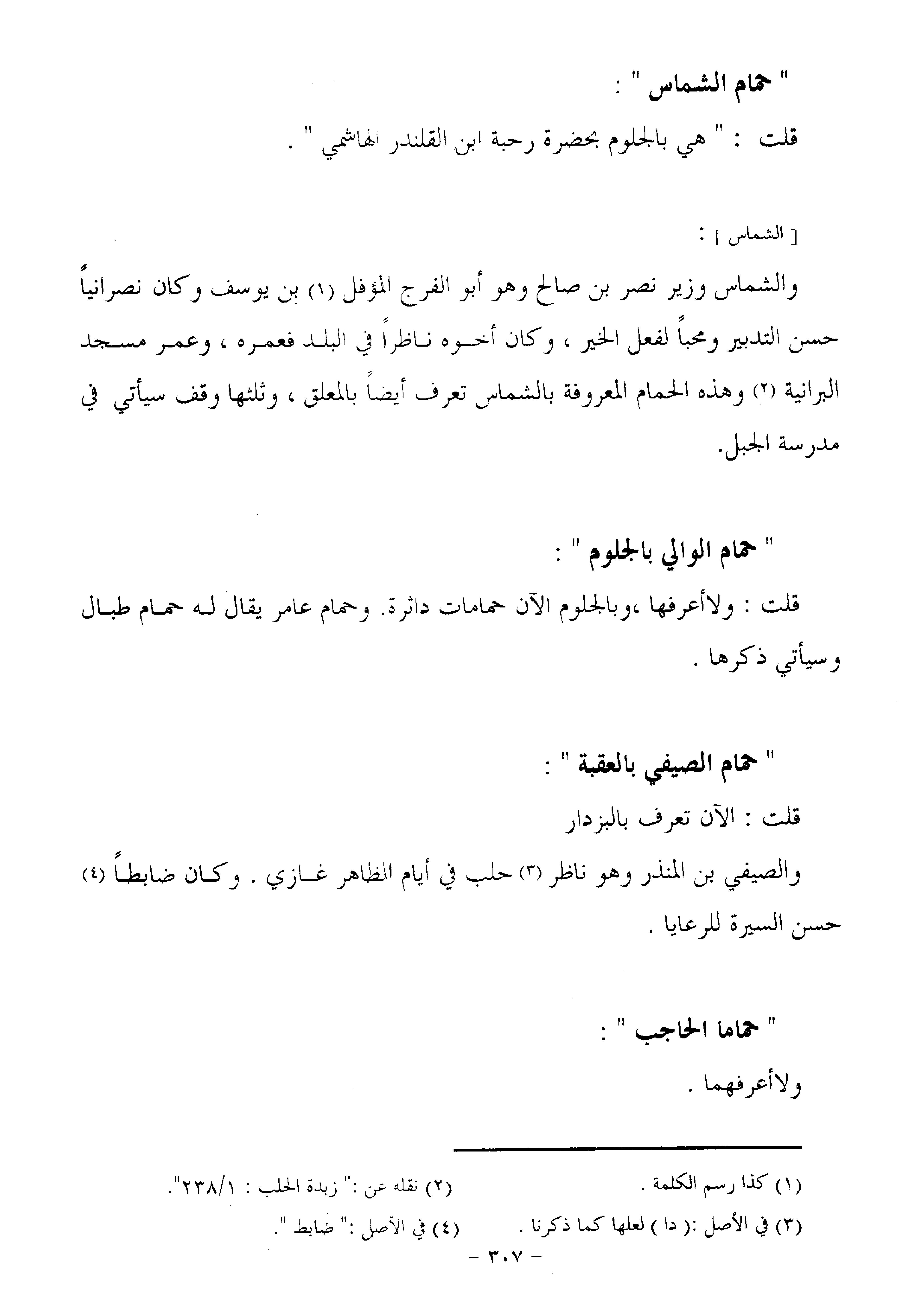 والشماس وزير نصر بن صالح وهو أبو الفرج المؤفل «1» بن يوسف وكان نصرانيا حسن التدبير ومحبا لفعل الخير، وكان أخوه ناظرا في البلد فعمره، وعمر مسجد البرانية «2» وهذه الحمام المعروفة بالشماس تعرف أيضا بالمعلق، وثلثها وقف سيأتي في مدرسة الجبل.