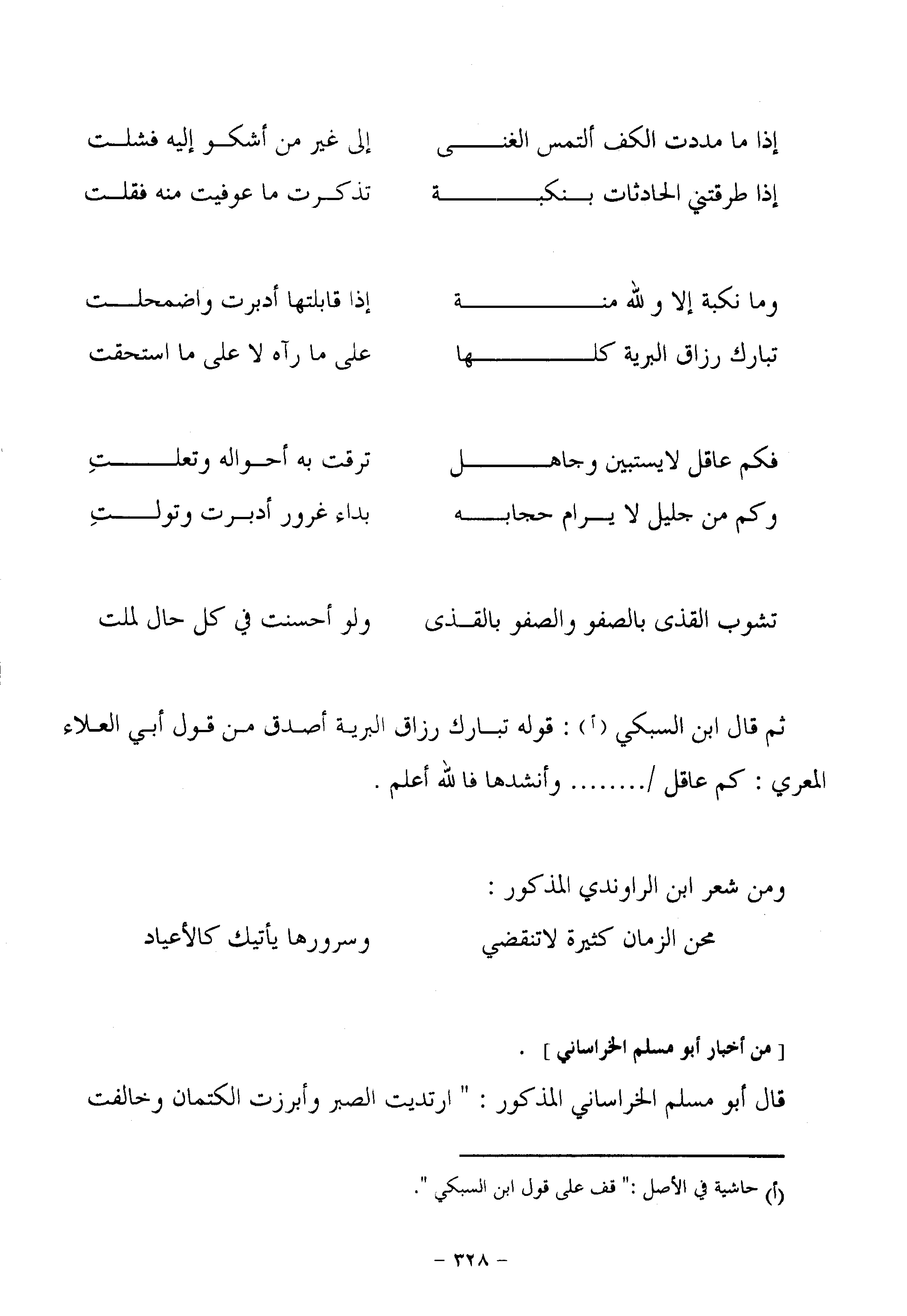 ثم قال ابن السبكي أ: قوله تبارك رزاق البرية أصدق من قول أبي العلاء المعري: كم عاقل/...... وأنشدها فالله أعلم.