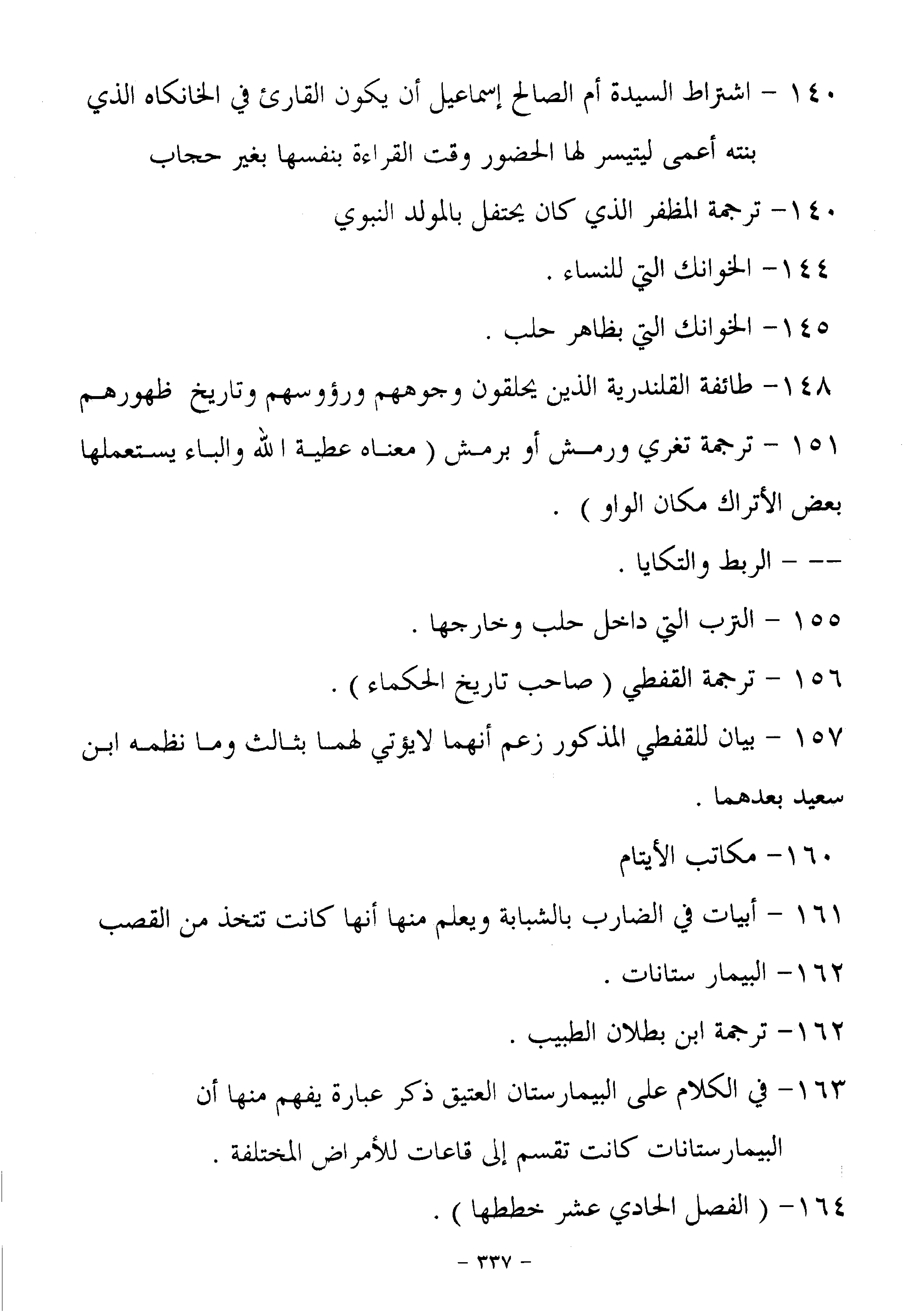 163- في الكلام على البيمارستان العتيق ذكر عبارة يفهم منها أن البيمارستانات كانت تقسم إلى قاعات للأمراض المختلفة.