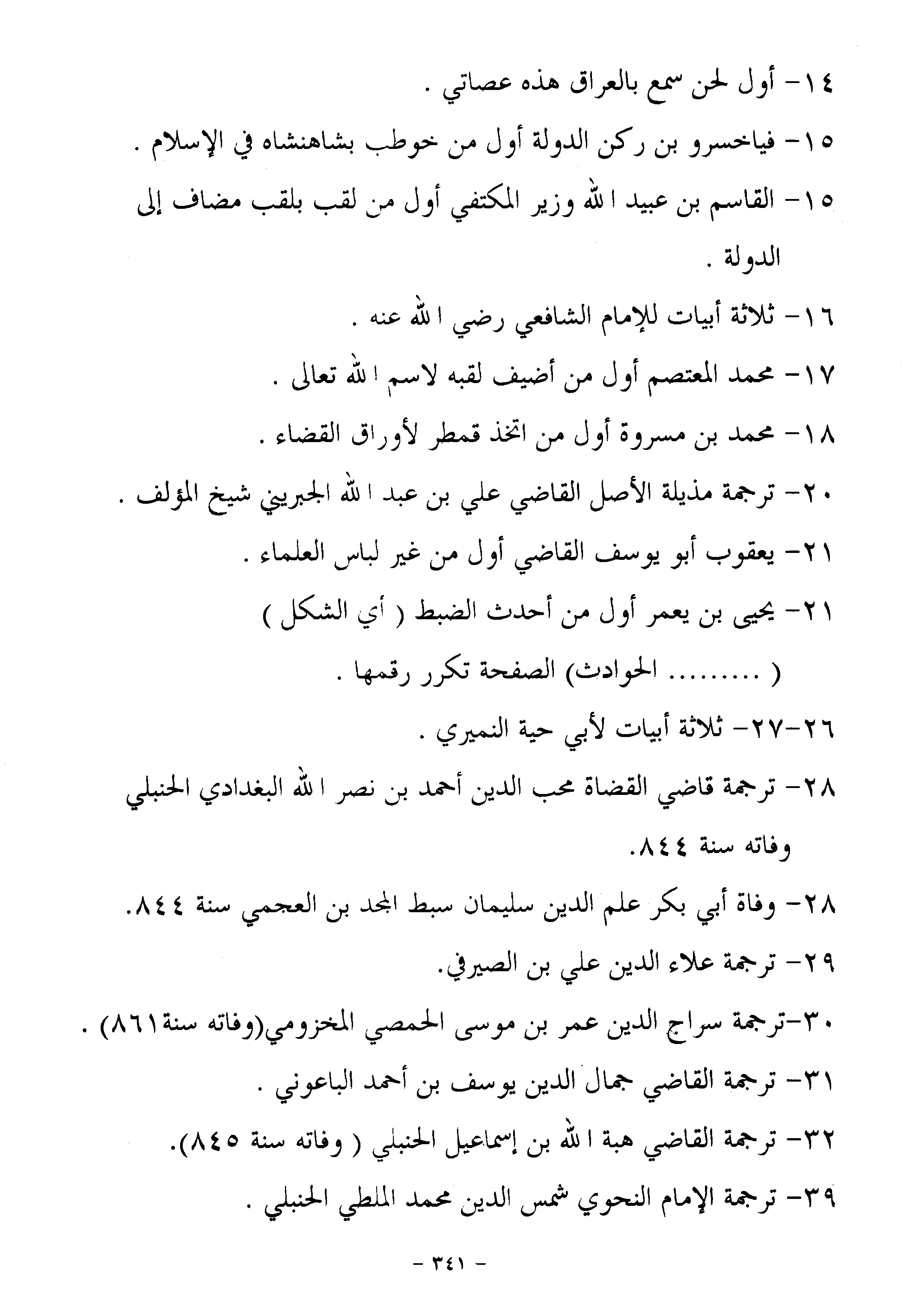 21- يحيى بن يعمر أول من أحدث الضبط (أي الشكل) (........ الحوادث) الصفحة تكرر رقمها.