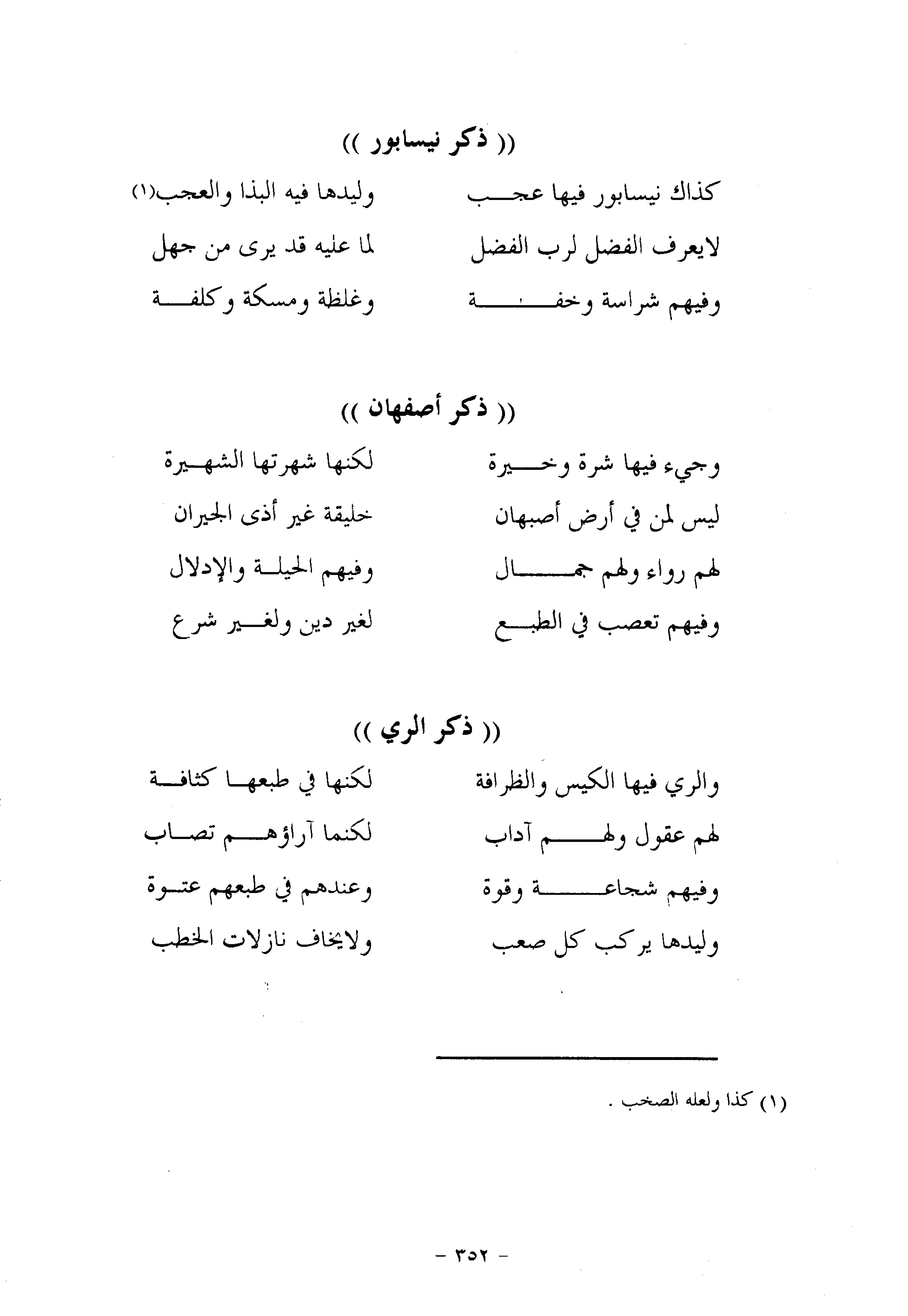 كذاك نيسابور فيها عجب ... وليدها فيه البذا والعجب «1»