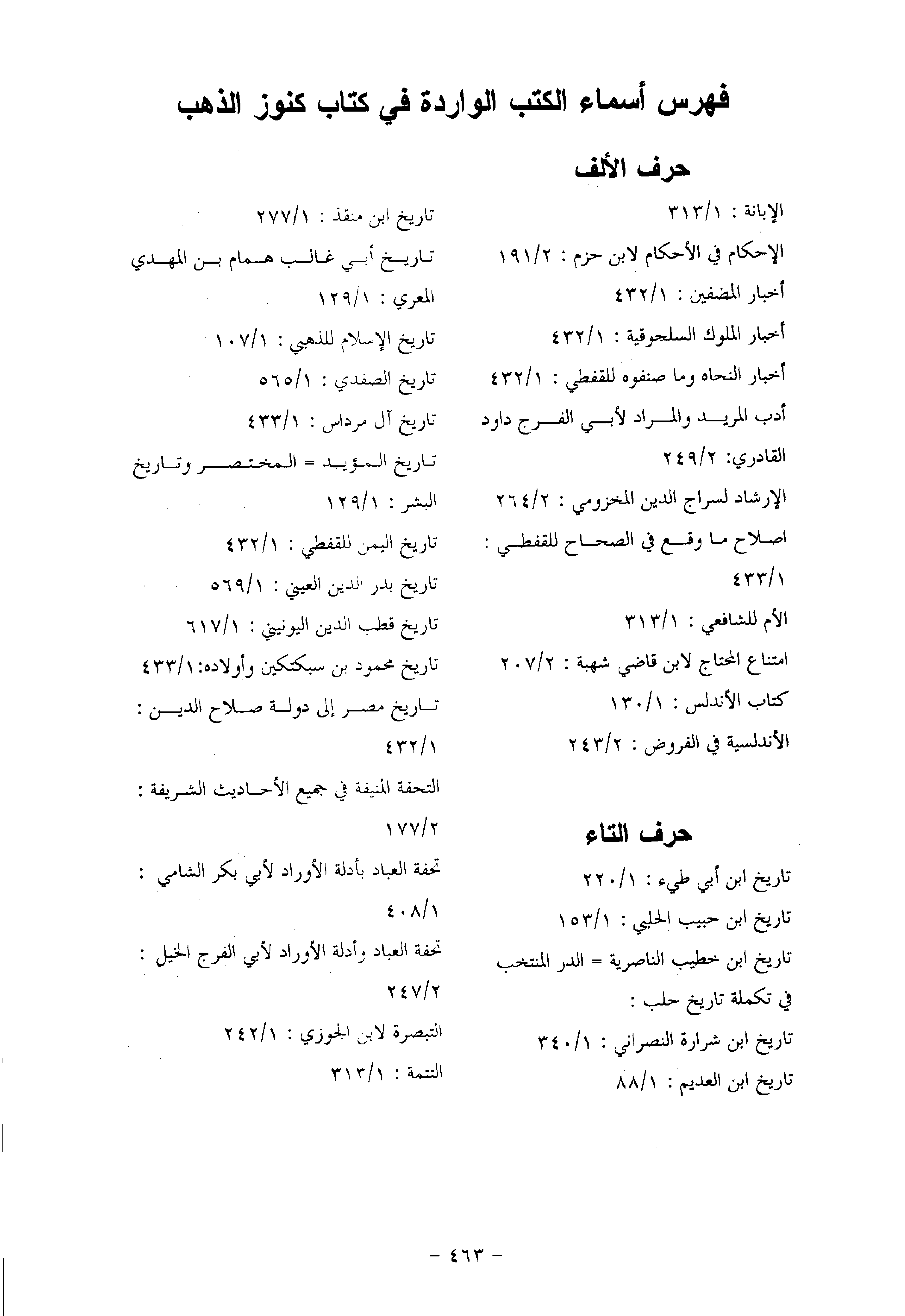 فهرس أسماء الكتب الواردة في كتاب كنوز الذهب حرف الألف الإبانة: 1/313
