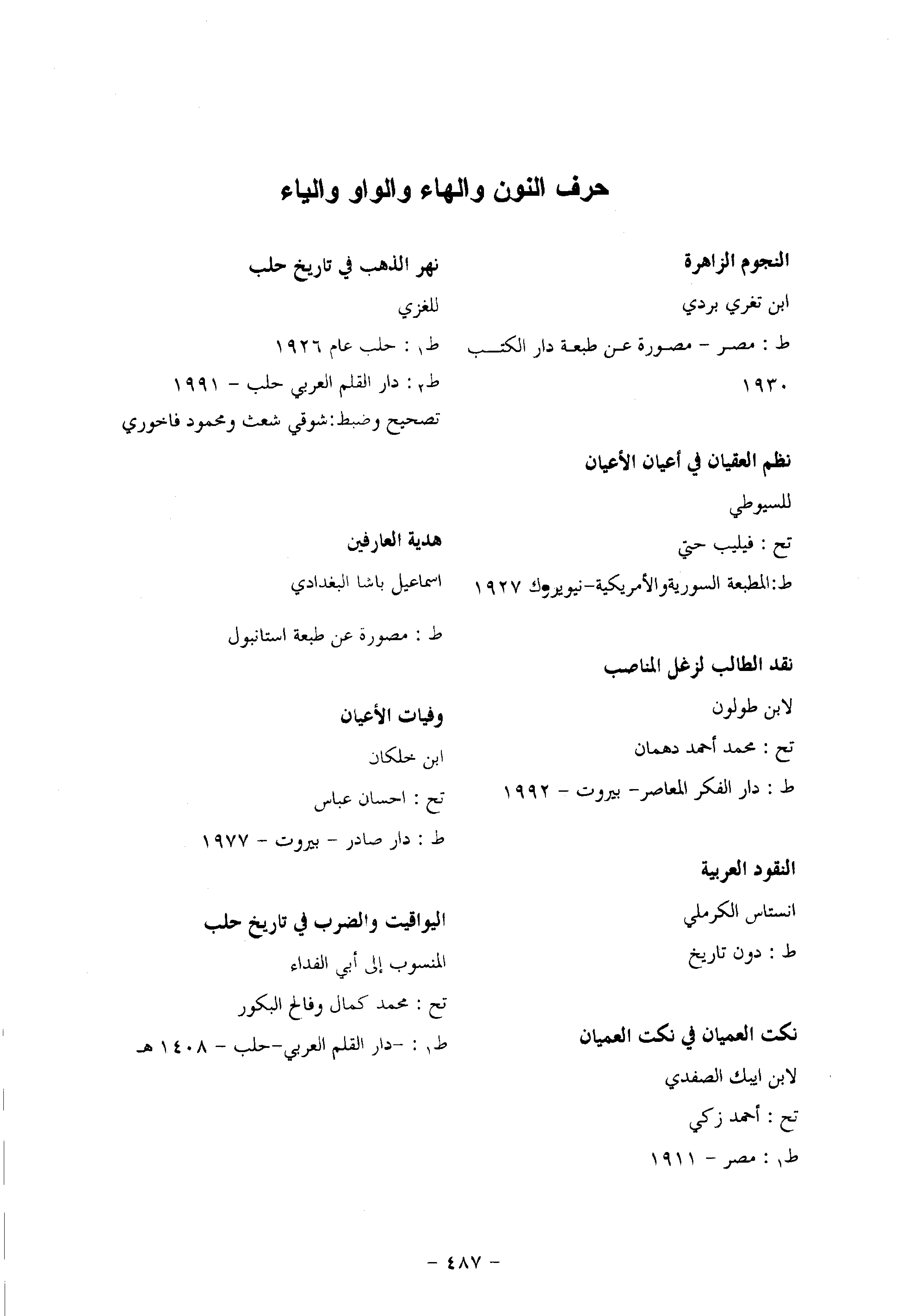 حرف النون والهاء والواو والياء النجوم الزاهرة ابن تغري بردي ط: مصر- مصورة عن طبعة دار الكتب 1930