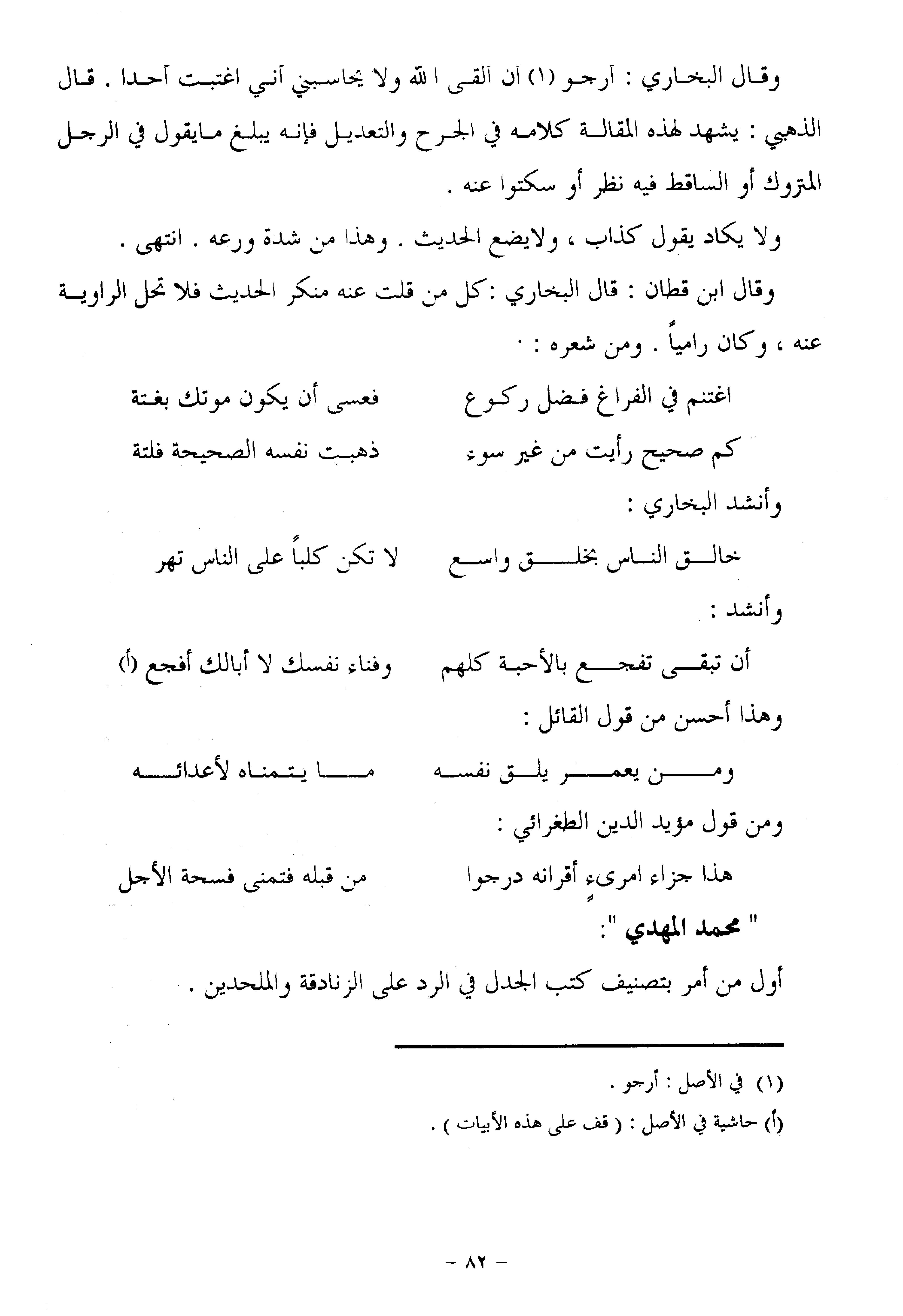 وقال البخاري: ارجو «1» أن القى الله ولا يحاسبني أني اغتبت أحدا. قال الذهبي: يشهد لهذه المقالة كلامه في الجرح والتعديل فإنه يبلغ ما يقول في الرجل المتروك أو الساقط فيه نظر أو سكتوا عنه.