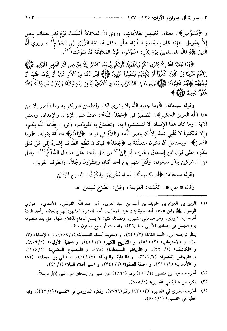 وَما جَعَلَهُ اللَّهُ إِلاَّ بُشْرى لَكُمْ وَلِتَطْمَئِنَّ قُلُوبُكُمْ بِهِ وَمَا النَّصْرُ إِلاَّ مِنْ عِنْدِ اللَّهِ الْعَزِيزِ الْحَكِيمِ (126) لِيَقْطَعَ طَرَفاً مِنَ الَّذِينَ كَفَرُوا أَوْ يَكْبِتَهُمْ فَيَنْقَلِبُوا خائِبِينَ (127) لَيْسَ لَكَ مِنَ الْأَمْرِ شَيْءٌ أَوْ يَتُوبَ عَلَيْهِمْ أَوْ يُعَذِّبَهُمْ فَإِنَّهُمْ ظالِمُونَ (128) وَلِلَّهِ مَا فِي السَّماواتِ وَما فِي الْأَرْضِ يَغْفِرُ لِمَنْ يَشاءُ وَيُعَذِّبُ مَنْ يَشاءُ وَاللَّهُ غَفُورٌ رَحِيمٌ (129)