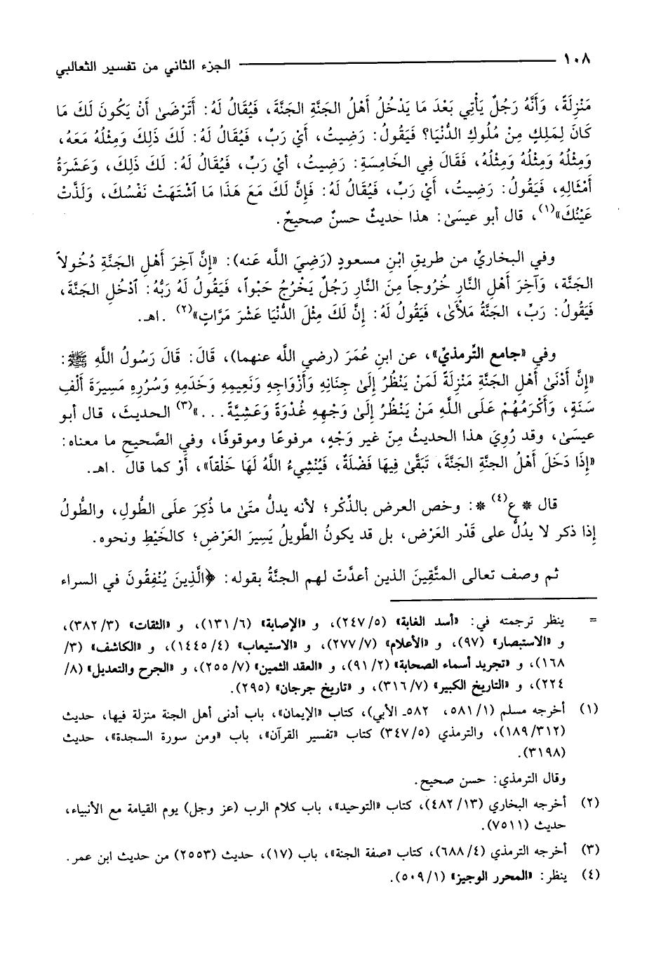(1) أخرجه مسلم (1/ 581، 582- الأبي) ، كتاب «الإيمان» ، باب أدنى أهل الجنة منزلة فيها، حديث (312/ 189) ، والترمذي (5/ 347) كتاب «تفسير القرآن» ، باب «ومن سورة السجدة» ، حديث (3198) .