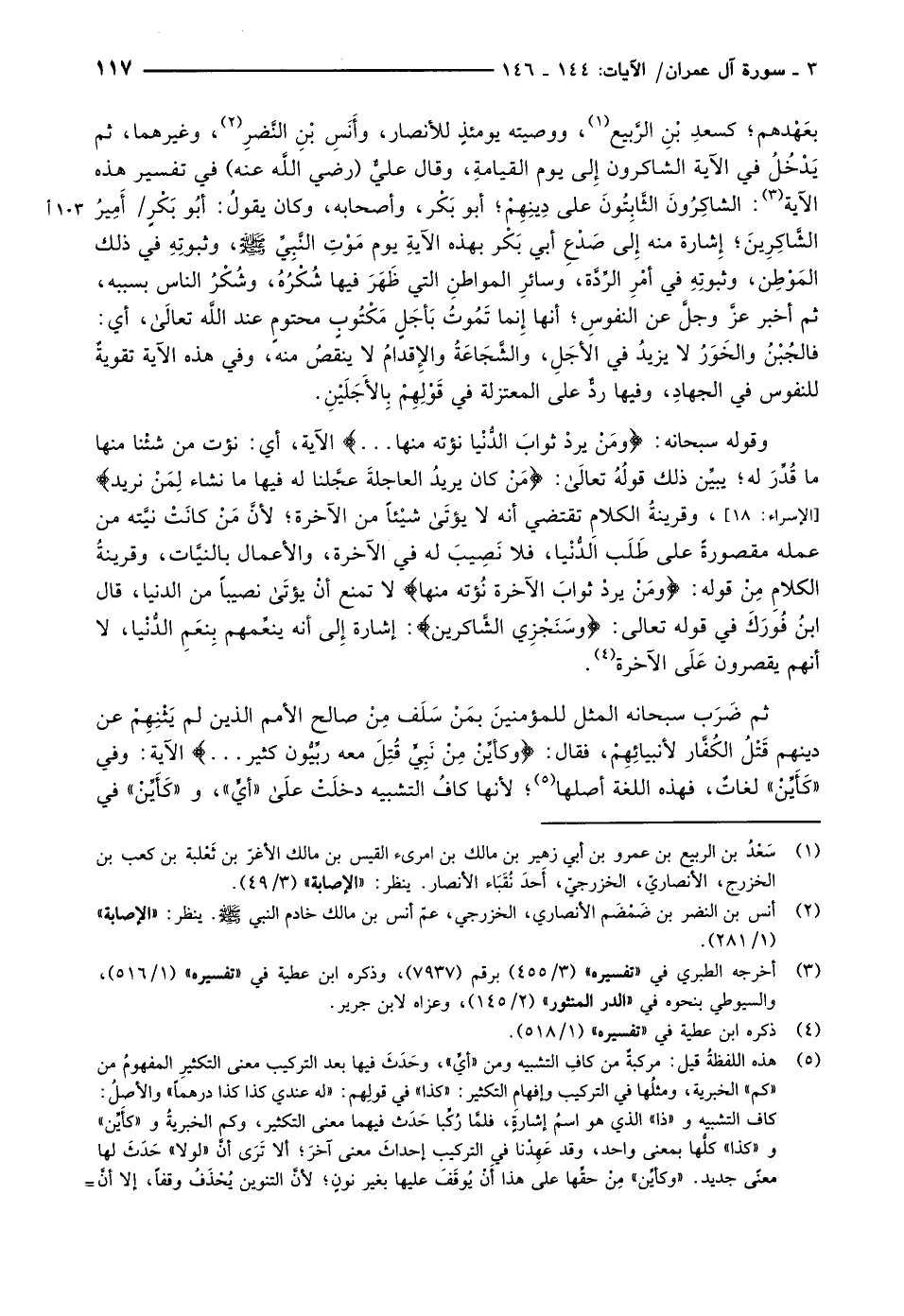 بعدهم كسعدِ بْنِ الرَّبيع «1» ، ووصيته يومئذٍ للأنصار، وأَنَسِ بْنِ النَّضرِ «2» ، وغيرهما، ثم يَدْخُلُ في الآية الشاكرون إلى يوم القيامةِ، وقال عليٌّ (رضي اللَّه عنه) في تفسير هذه الآية «3» : الشاكِرُونَ الثَّابِتُونَ على دِينِهِمْ أبو بَكْر، وأصحابه، وكان يقولُ: أبُو بَكْرٍ/ أَمِيرُ الشَّاكِرِينَ إشارة منه إلى صَدْعِ أبي بَكْر بهذه الآيةِ يوم موت النّبيّ صلّى الله عليه وسلّم، وثبوتِهِ في ذلك المَوْطِن، وثبوتِهِ في أمْرِ الرِّدَّة، وسائرِ المواطنِ التي ظَهَرَ فيها شُكْرُهُ، وشُكْرُ الناس بسببه، ثم أخبر عزَّ وجلَّ عن النفوسِ أنها إنما تَمُوتُ بَأجَلٍ مَكْتُوبٍ محتومٍ عند اللَّه تعالى، أي: