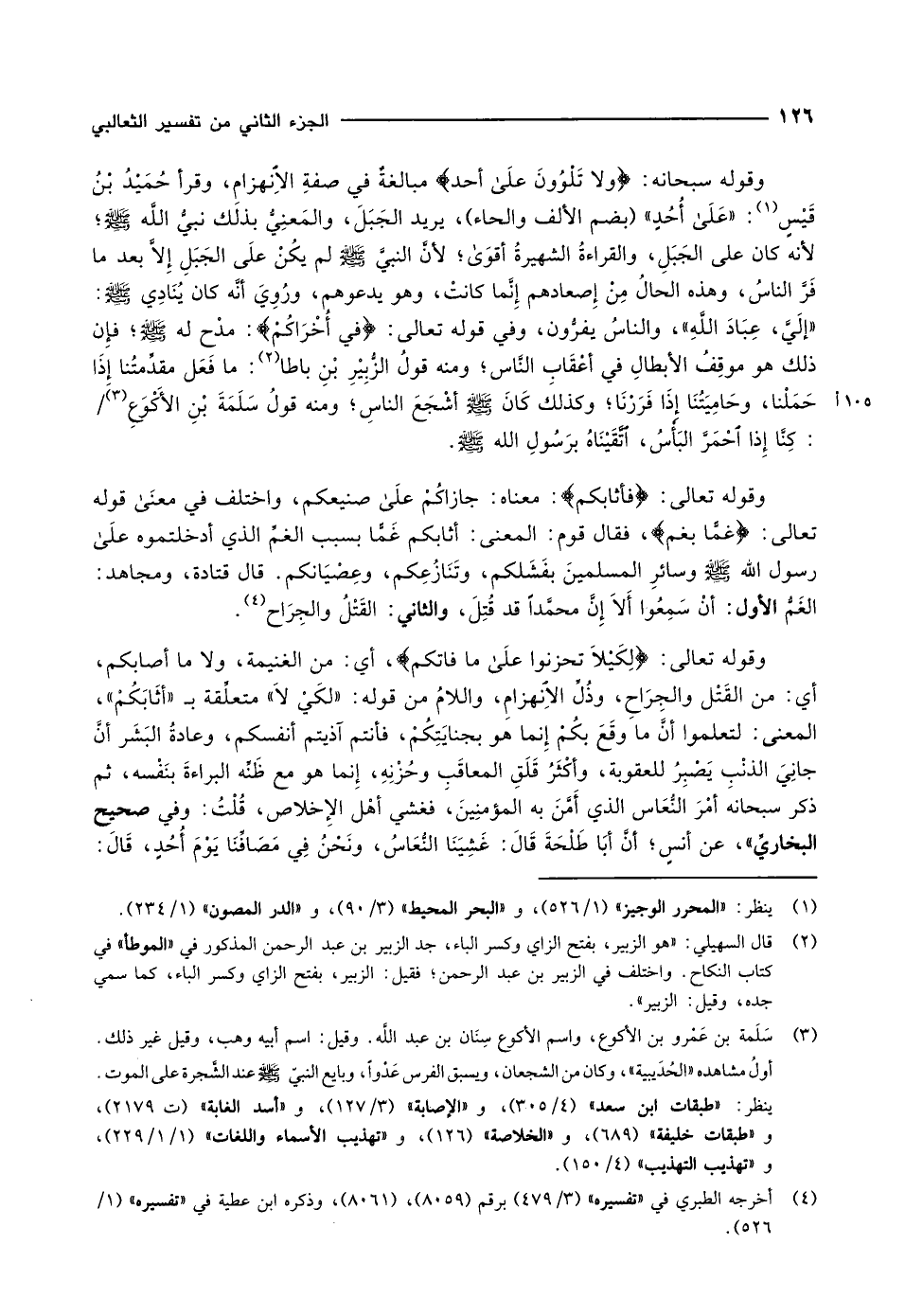 وقوله سبحانه: وَلا تَلْوُونَ عَلى أَحَدٍ مبالغةٌ في صفةِ الانهزامِ، وقرأ حُمَيْدُ بْنُ قَيْسٍ «1» : «على أُحُدٍ» (بضم الألف والحاء) ، يريد الجَبَلَ، والمعنيّ بذلك نبيّ الله صلّى الله عليه وسلّم لأنه كان على الجَبَلِ، والقراءةُ الشهيرةُ أقوى لأنّ النبيّ صلّى الله عليه وسلّم لم يكُنْ علَى الجَبَلِ إلاَّ بعد ما فَرَّ الناسُ، وهذه الحالُ مِنْ إصعادهم إنَّما كانتْ، وهو يدعوهم، ورُوِيَ أنَّه كان يُنَادِي صلّى الله عليه وسلّم: