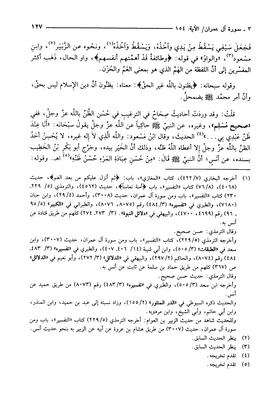 قلْتُ: وقد وردَتْ أحاديثُ صِحَاحٌ في الترغيبِ في حُسْن الظَّنِّ باللَّه عزَّ وجلَّ، ففي «صحيح مسلم» ، وغيره، عن النبيّ صلّى الله عليه وسلّم حاكِياً عن اللَّه عزَّ وجلَّ يقولُ سبْحَانه: «أَنَا عِنْدَ ظَنِّ عَبْدِي بِي ... » «4» الحديثَ، وقال ابْنُ مَسْعود: واللَّه الَّذِي لاَ إله غيره، لا يُحْسِنُ أحَدٌ الظنَّ باللَّه عزَّ وجلَّ إلا أعطاه اللَّهُ ظنَّه، وذلك أنَّ الخَيْر بيده، وخرَّج أبو بَكْرِ بْنُ الخَطِيب بسنده، عن أنس أنّ النبيّ صلّى الله عليه وسلّم قَالَ: «مِنْ حُسْنِ عِبَادَةِ المَرْءِ حُسْنُ ظَنِّهِ» «5» اهـ. وقوله: