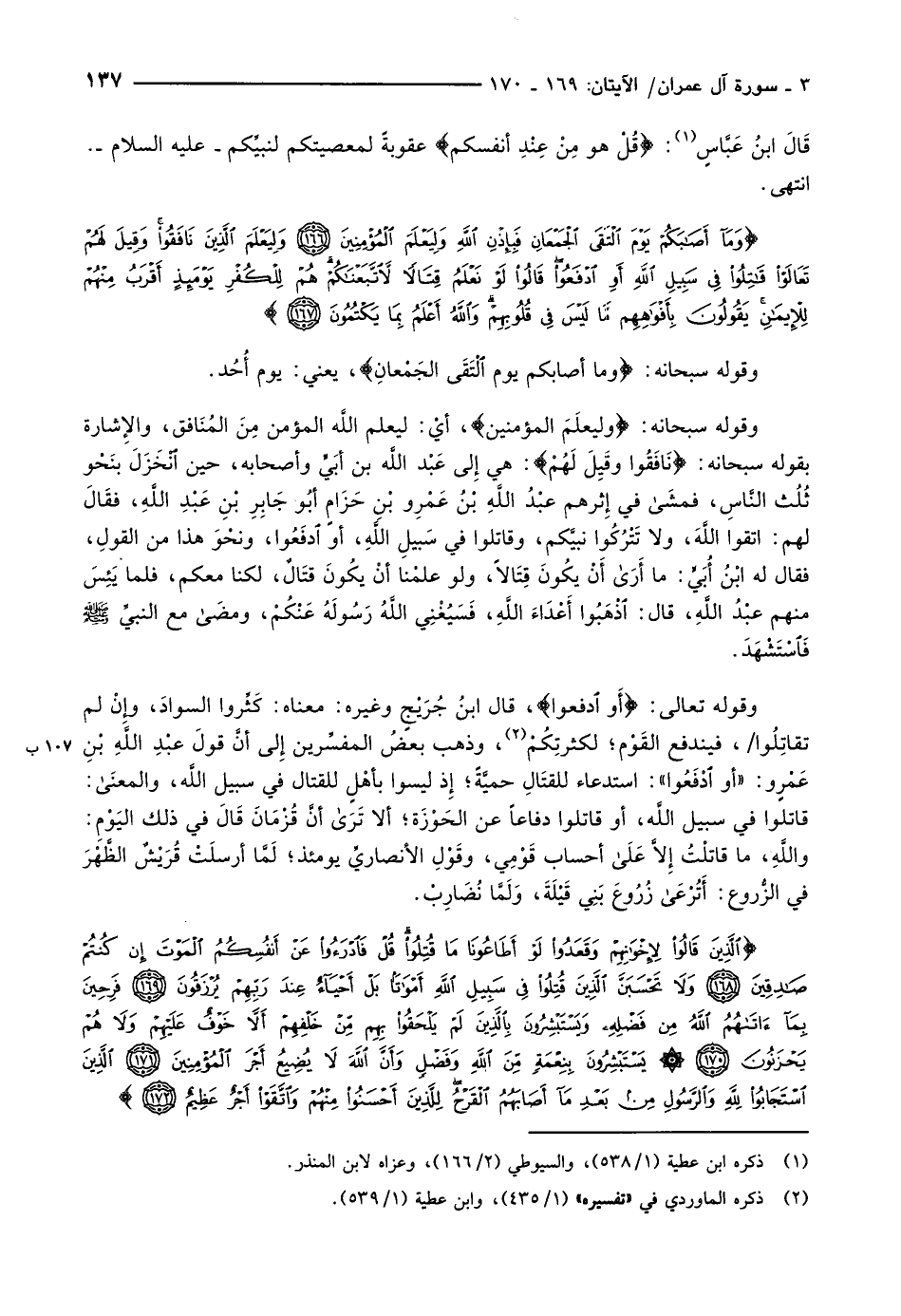 الَّذِينَ قالُوا لِإِخْوانِهِمْ وَقَعَدُوا لَوْ أَطاعُونا مَا قُتِلُوا قُلْ فَادْرَؤُا عَنْ أَنْفُسِكُمُ الْمَوْتَ إِنْ كُنْتُمْ صادِقِينَ (168) وَلا تَحْسَبَنَّ الَّذِينَ قُتِلُوا فِي سَبِيلِ اللَّهِ أَمْواتاً بَلْ أَحْياءٌ عِنْدَ رَبِّهِمْ يُرْزَقُونَ (169) فَرِحِينَ بِما آتاهُمُ اللَّهُ مِنْ فَضْلِهِ وَيَسْتَبْشِرُونَ بِالَّذِينَ لَمْ يَلْحَقُوا بِهِمْ مِنْ خَلْفِهِمْ أَلاَّ خَوْفٌ عَلَيْهِمْ وَلا هُمْ يَحْزَنُونَ (170) يَسْتَبْشِرُونَ بِنِعْمَةٍ مِنَ اللَّهِ وَفَضْلٍ وَأَنَّ اللَّهَ لا يُضِيعُ أَجْرَ الْمُؤْمِنِينَ (171) الَّذِينَ اسْتَجابُوا لِلَّهِ وَالرَّسُولِ مِنْ بَعْدِ ما أَصابَهُمُ الْقَرْحُ لِلَّذِينَ أَحْسَنُوا مِنْهُمْ وَاتَّقَوْا أَجْرٌ عَظِيمٌ (172)