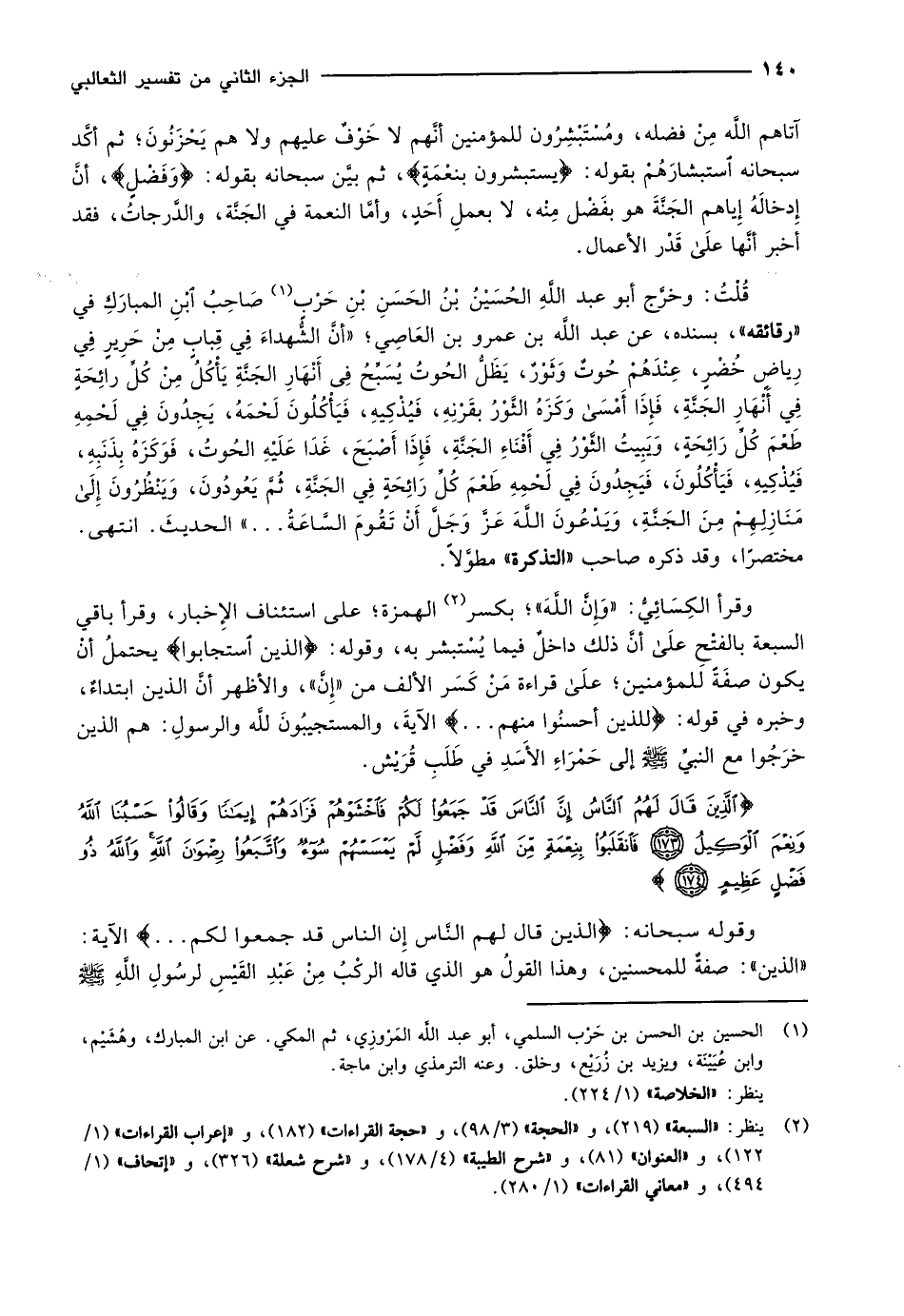 آتاهم اللَّه مِنْ فضله، ومُسْتَبْشِرُون للمؤمنين أنَّهم لا خَوْفٌ عليهم ولا هم يَحْزَنُونَ ثم أكَّد سبحانه استبشارهم بقوله: يَسْتَبْشِرُونَ بِنِعْمَةٍ، ثم بيَّن سبحانه بقوله: وَفَضْلٍ، أنَّ إدخالَهُ إياهم الجَنَّةَ هو بفَضْل مِنْه، لا بعملِ أَحَدٍ، وأمَّا النعمة في الجَنَّة، والدَّرجاتُ، فقد أخبر أنَّها على قَدْر الأعمال.