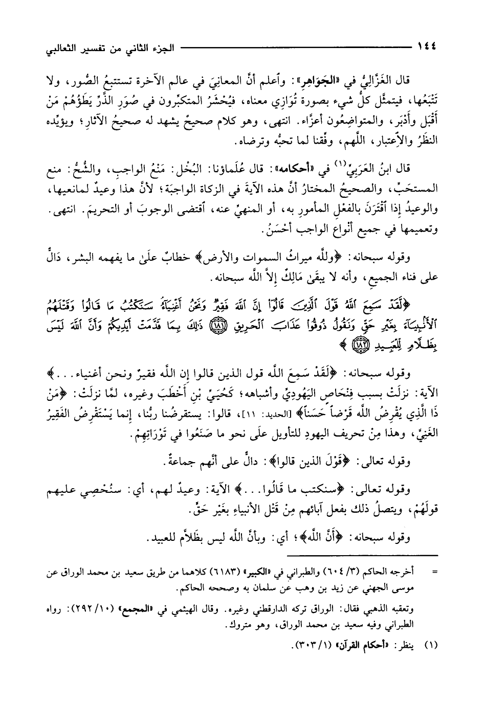 لَقَدْ سَمِعَ اللَّهُ قَوْلَ الَّذِينَ قالُوا إِنَّ اللَّهَ فَقِيرٌ وَنَحْنُ أَغْنِياءُ سَنَكْتُبُ ما قالُوا وَقَتْلَهُمُ الْأَنْبِياءَ بِغَيْرِ حَقٍّ وَنَقُولُ ذُوقُوا عَذابَ الْحَرِيقِ (181) ذلِكَ بِما قَدَّمَتْ أَيْدِيكُمْ وَأَنَّ اللَّهَ لَيْسَ بِظَلاَّمٍ لِلْعَبِيدِ (182)