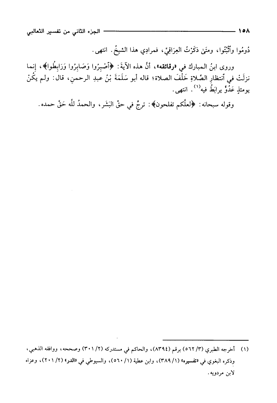 وروى ابنُ المبارك في «رقائقه» ، أنَّ هذه الآيةَ: اصْبِرُوا وَصابِرُوا وَرابِطُوا، إنما نزلَتْ في انتظار الصَّلاةِ خَلْفَ الصلاة قاله أبو سَلَمَةَ بْنُ عبدِ الرحمنِ، قال: ولم يكُنْ يومئذٍ عَدُوٌّ يرابَطُ فيه «1» . انتهى.
