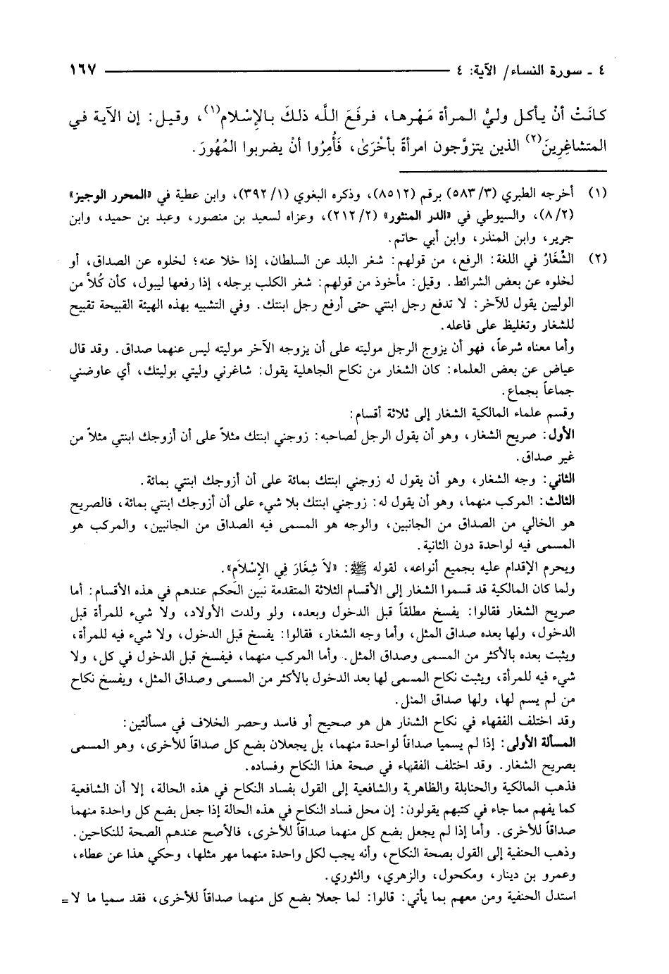(2) الشّغار في اللغة: الرفع، من قولهم: شغر البلد عن السلطان، إذا خلا عنه لخلوه عن الصداق، أو لخلوه عن بعض الشرائط. وقيل: مأخوذ من قولهم: شغر الكلب برجله، إذا رفعها ليبول، كأن كلّا من الوليين يقول للآخر: لا تدفع رجل ابنتي حتى أرفع رجل ابنتك. وفي التشبيه بهذه الهيئة القبيحة تقبيح للشغار وتغليظ على فاعله.