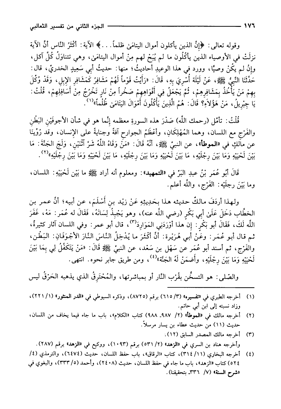ولهذا أردَفَ مالكٌ حديثه هذا بحَدِيثِهِ عَنْ زيْد بنِ أَسْلَمَ، عن أبيه أنَّ عمر بن الخطَّاب دَخَلَ على أبِي بَكْرٍ (رضي اللَّه عنه) ، وهو يَجْبِذُ لِسَانَهُ، فَقَالَ له عُمَر: مَهْ، غَفَرَ اللَّه لَكَ، فَقَالَ أبو بَكْرٍ: إن هذا أوْرَدَنِي المَوَارِدَ «3» ، قال أبو عمر: وفي اللسان آثار كثيرةٌ، ثم قال أبو عُمَر: وعَنْ أبي هُرَيْرة: إنَّ أكْثَرَ ما يُدْخِلُ النَّاسَ النَّارَ الأجْوَفَانِ: البَطْن، والفَرْج، ثم أسند أبو عُمَر عن سهل بن سعد، عن النبيّ صلّى الله عليه وسلّم قَالَ: «مَنْ يَتَكَفَّلُ لِي بِمَا بَيْنَ لَحْيَيْهِ وَمَا بَيْنَ رِجْلَيْهِ، وأَضمَنْ لَهُ الجَنَّة» «4» ، ومن طريق جابر نحوه. انتهى.
