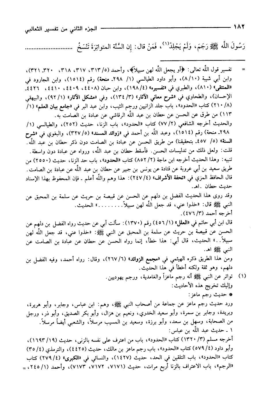 - تفسير قول الله تعالى: أَوْ يَجْعَلَ اللَّهُ لَهُنَّ سَبِيلًا، وأحمد (5/ 313، 317، 318، 320- 321) ، وابن أبي شيبة (10/ 8) ، وأبو داود الطيالسي (1/ 298- منحة) رقم (1514) ، وابن الجارود في «المنتقى» (810) ، والطبري في «تفسيره» (4/ 198) ، وابن حبان (4408، 4409، 4410، 4426- الإحسان) ، والطحاوي في «شرح معاني الآثار» (3/ 134) ، وفي «مشكل الآثار» (1/ 92) ، والبيهقي (8/ 210) كتاب «الحدود» ، باب جلد الزانيين ورجم الثيب، وابن عبد البر في «جامع بيان العلم» (1/ 113) من طرق عن الحسن عن حطان بن عبد الله الرقاشي عن عبادة بن الصامت به.