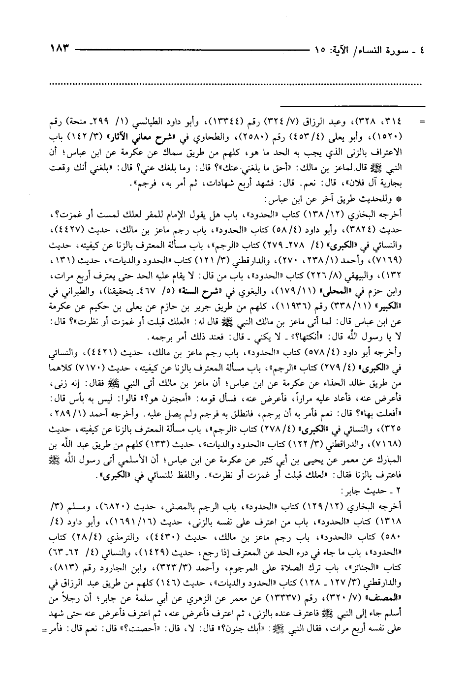 - 314، 328) ، وعبد الرزاق (7/ 324) رقم (13344) ، وأبو داود الطيالسي (1/ 299- منحة) رقم (1520) ، وأبو يعلى (4/ 453) رقم (2580) ، والطحاوي في «شرح معاني الآثار» (3/ 142) باب الاعتراف بالزنى الذي يجب به الحد ما هو، كلهم من طريق سماك عن عكرمة عن ابن عباس أن النبيّ صلّى الله عليه وسلّم قال لماعز بن مالك: «أحق ما بلغني عنك» ؟ قال: وما بلغك عني؟ قال: «بلغني أنك وقعت بجارية آل فلان» ، قال: نعم. قال: فشهد أربع شهادات، ثم أمر به، فرجم» .