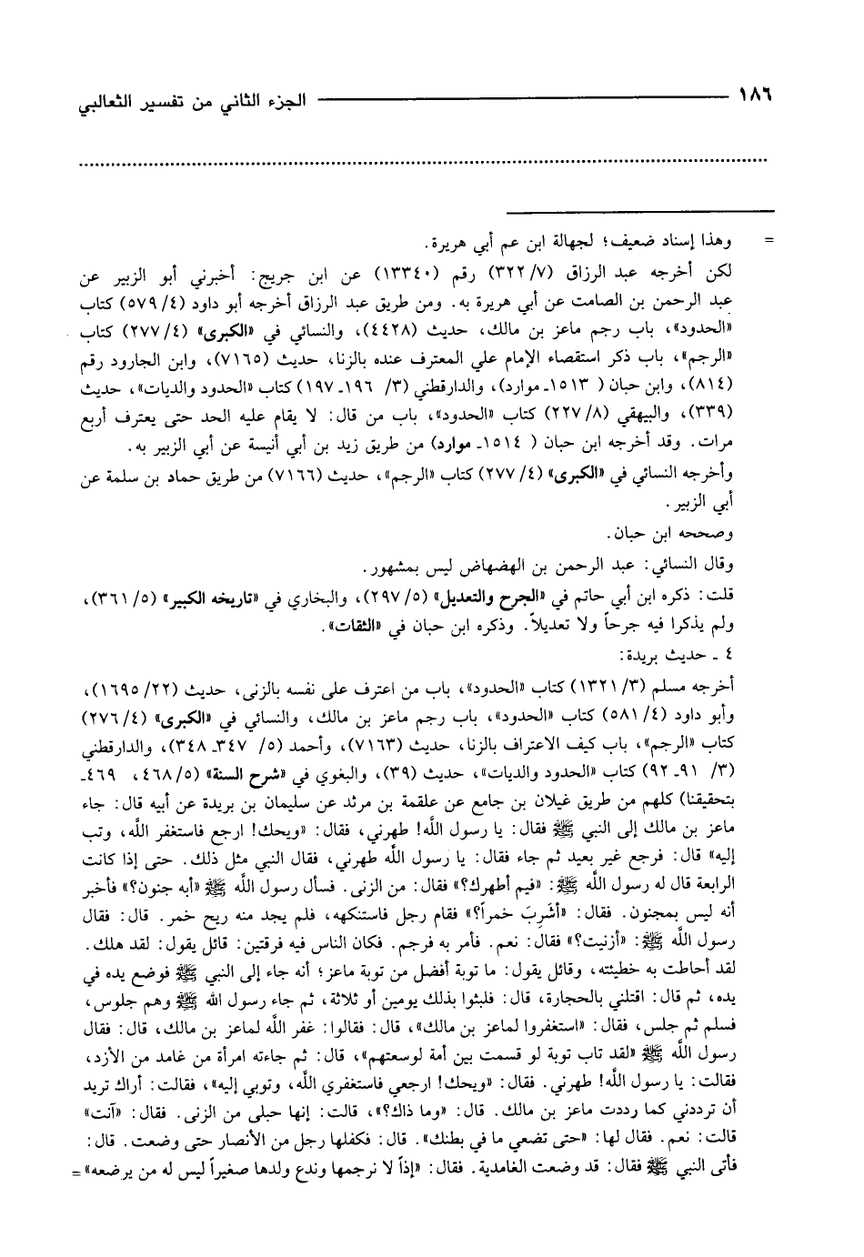 أخرجه مسلم (3/ 1321) كتاب «الحدود» ، باب من اعترف على نفسه بالزنى، حديث (22/ 1695) ، وأبو داود (4/ 581) كتاب «الحدود» ، باب رجم ماعز بن مالك، والنسائي في «الكبرى» (4/ 276) كتاب «الرجم» ، باب كيف الاعتراف بالزنا، حديث (7163) ، وأحمد (5/ 347- 348) ، والدارقطني (3/ 91- 92) كتاب «الحدود والديات» ، حديث (39) ، والبغوي في «شرح السنة» (5/ 468، 469- بتحقيقنا) كلهم من طريق غيلان بن جامع عن علقمة بن مرثد عن سليمان بن بريدة عن أبيه قال: جاء ماعز بن مالك إلى النبيّ صلّى الله عليه وسلّم فقال: يا رسول الله! طهرني، فقال: «ويحك! ارجع فاستغفر الله، وتب إليه» قال: فرجع غير بعيد ثم جاء فقال: يا رسول الله طهرني، فقال النبيّ مثل ذلك. حتى إذا كانت الرابعة قال له رسول الله صلّى الله عليه وسلّم: «فيم أطهرك؟» فقال: من الزنى. فسأل رسول الله صلّى الله عليه وسلّم «أبه جنون؟» فأخبر أنه ليس بمجنون. فقال: «أشرب خمرا؟» فقام رجل فاستنكهه، فلم يجد منه ريح خمر. قال: فقال رسول الله صلّى الله عليه وسلّم: «أزنيت؟» فقال: نعم. فأمر به فرجم. فكان الناس فيه فرقتين: قائل يقول: لقد هلك.