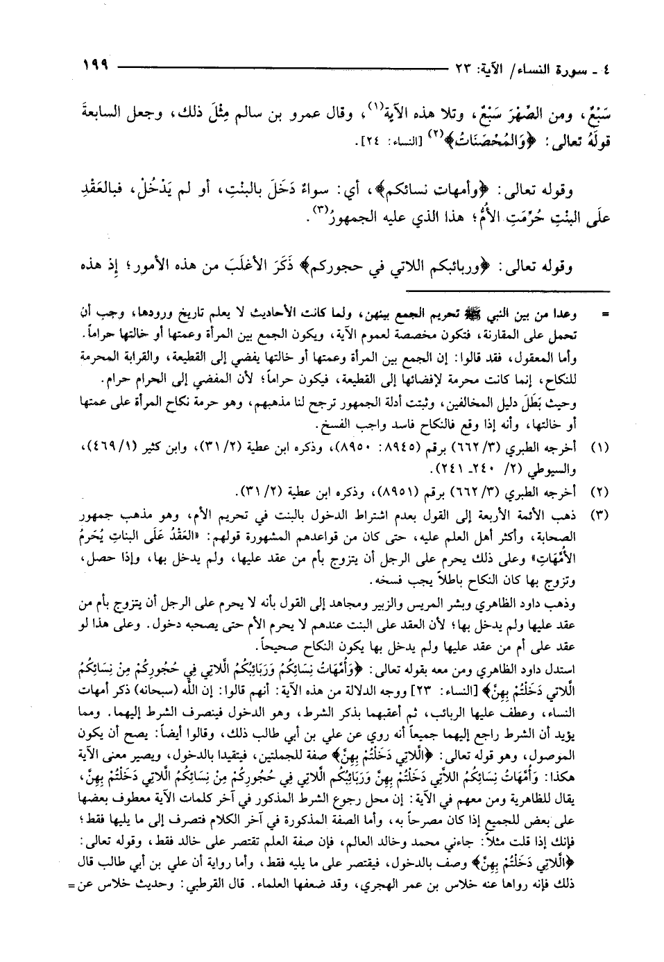 - وعدا من بين النبيّ صلّى الله عليه وسلّم تحريم الجمع بينهن، ولما كانت الأحاديث لا يعلم تاريخ ورودها، وجب أن تحمل على المقارنة، فتكون مخصصة لعموم الآية، ويكون الجمع بين المرأة وعمتها أو خالتها حراما.