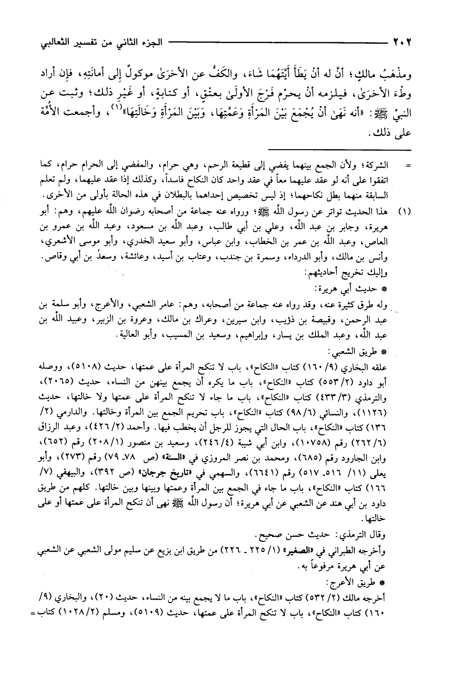 علقه البخاري (9/ 160) كتاب «النكاح» ، باب لا تنكح المرأة على عمتها، حديث (5108) ، ووصله أبو داود (2/ 553) كتاب «النكاح» ، باب ما يكره أن يجمع بينهن من النساء، حديث (2065) ، والترمذي (3/ 433) كتاب «النكاح» ، باب ما جاء لا تنكح المرأة على عمتها ولا خالتها، حديث (1126) ، والنسائي (6/ 98) كتاب «النكاح» ، باب تحريم الجمع بين المرأة وخالتها. والدارمي (2/ 136) كتاب «النكاح» ، باب الحال التي يجوز للرجل أن يخطب فيها. وأحمد (2/ 426) ، وعبد الرزاق (6/ 262) رقم (10758) ، وابن أبي شيبة (4/ 246) ، وسعيد بن منصور (1/ 208) رقم (652) ، وابن الجارود رقم (685) ، ومحمد بن نصر المروزي في «السنة» (ص 78- 79) رقم (273) ، وأبو يعلى (11/ 516- 517) رقم (6641) ، والسهمي في «تاريخ جرجان» (ص 392) ، والبيهقي (7/ 166) كتاب «النكاح» ، باب ما جاء في الجمع بين المرأة وعمتها وبينها وبين خالتها. كلهم من طريق داود بن أبي هند عن الشعبي عن أبي هريرة أن رسول الله صلّى الله عليه وسلّم نهى أن تنكح المرأة على عمتها أو على خالتها.