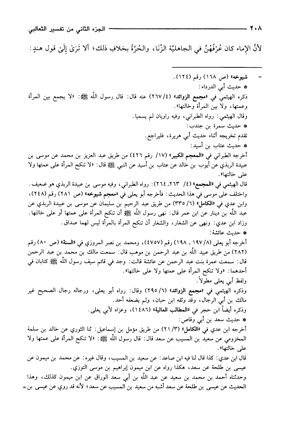 أخرجه أبو يعلى (8/ 197- 198) رقم (4757) ، ومحمد بن نصر المروزي في «السنة» (ص 80) رقم (282) من طريق عبيد الله بن عبد الرّحمن بن موهب قال: سمعت مالك بن محمد بن عبد الرّحمن قال: سمعت عمرة بنت عبد الرّحمن عن عائشة قالت: وجد في قائم سيف رسول الله صلّى الله عليه وسلّم كتابان في أحدهما: «ولا تنكح المرأة على عمتها ولا على خالتها» .
