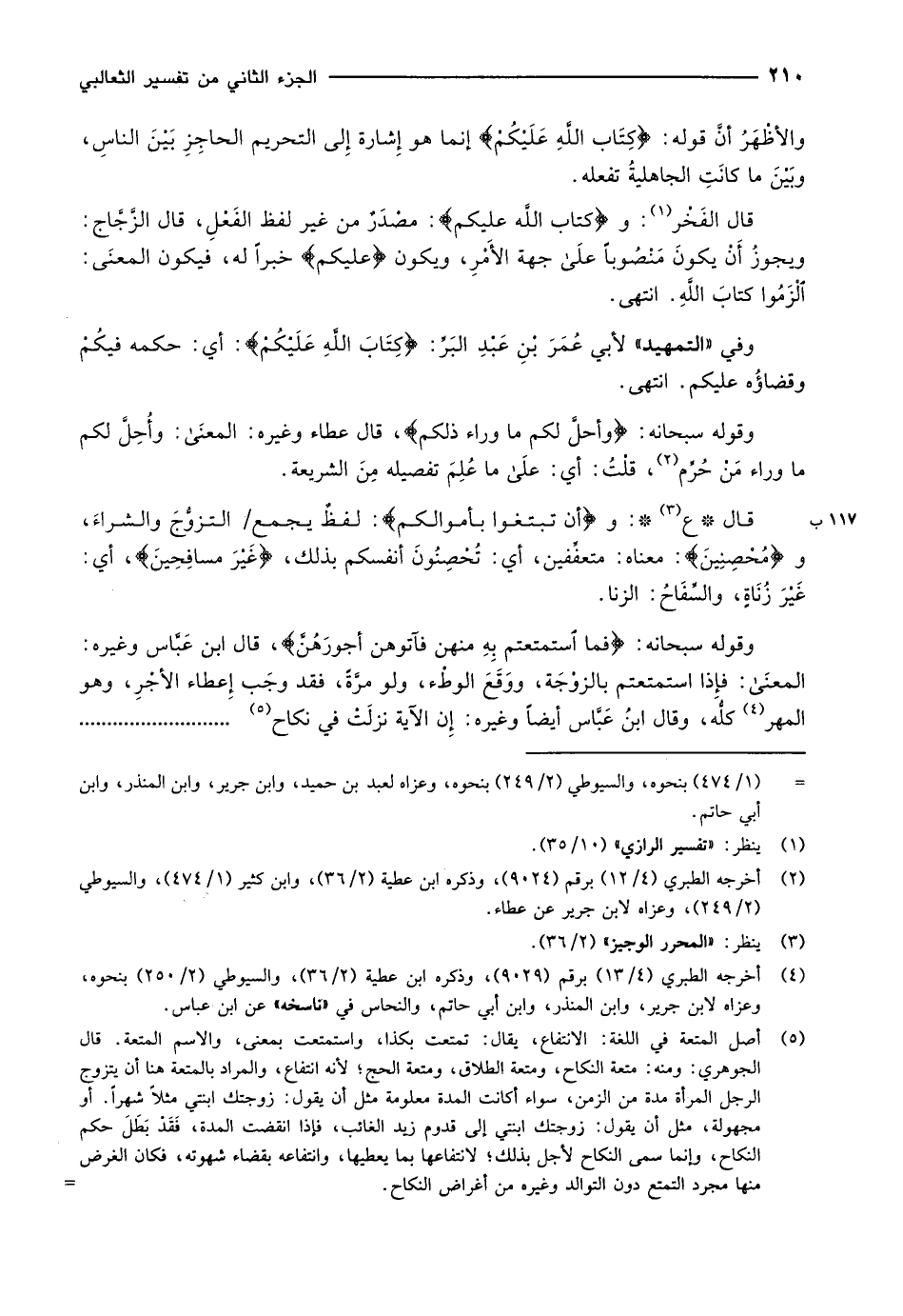 والأظْهَرُ أنَّ قوله: كِتابَ اللَّهِ عَلَيْكُمْ إنما هو إشارة إلى التحريم الحاجِزِ بَيْنَ الناسِ، وبَيْنَ ما كانَتِ الجاهليةُ تفعله.
