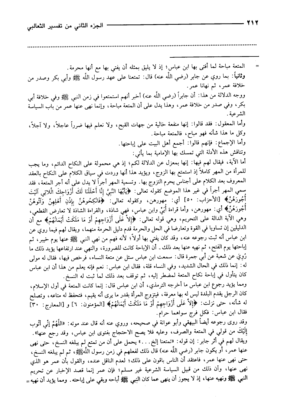 أما الآية، فيقال لهم فيها: إنها بمعزل عن الدلالة لكم إذ هي محمولة على النكاح الدائم، وما يجب للمرأة من المهر كاملا إذ استمتع بها الزوج، ويؤيد هذا أنها وردت في سياق الكلام على النكاح بالعقد المعروف بعد الكلام على أجناس يحرم التزوج بها. وتسمية المهر أجرا لا يدل على أنه أجر المتعة، فقد سمي المهر أجرا في غير هذا الموضع كقوله تعالى: يا أَيُّهَا النَّبِيُّ إِنَّا أَحْلَلْنا لَكَ أَزْواجَكَ اللَّاتِي آتَيْتَ أُجُورَهُنَّ [الأحزاب: 50] أي: مهورهن، وكقوله تعالى: فَانْكِحُوهُنَّ بِإِذْنِ أَهْلِهِنَّ وَآتُوهُنَّ أُجُورَهُنَّ أي: مهورهن، وأما قراءة أبيّ وابن عباس، فهي شاذة، والقراءة الشاذة لا تعارض القطعي، وهي الآية الدالة على التحريم، وهي قوله تعالى: إِلَّا عَلى أَزْواجِهِمْ أَوْ ما مَلَكَتْ أَيْمانُهُمْ مع أن الدليلين إن تساويا في القوة وتعارضا في الحل والحرمة قدم دليل الحرمة منهما، ويقال لهم فيما روي عن ابن عباس أنه ثبت رجوعه عنه، وقد كان يفتي بها أولا لأنه فهم من نهي النبيّ صلّى الله عليه وسلّم عنها يوم خيبر، ثم إباحتها يوم الفتح، ثم نهيه عنها بعد ذلك- أن الإباحة كانت للضرورة، والنهي عند ارتفاعها يؤيد ذلك ما روي عن شعبة عن أبي جمرة قال: سمعت ابن عباس سئل عن متعة النساء، فرخص فيها، فقال له مولى له: إنما ذلك في الحال الشديد، وفي النساء قلة، فقال ابن عباس: نعم فإنه يعلم من هذا أن ابن عباس كان يتأول في إباحة نكاح المتعة لمضطر إليه، ثم توقف بعد ذلك لما ثبت له النسخ.