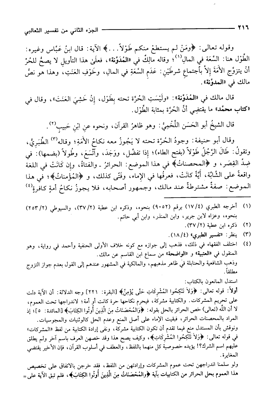 الطَّوْل هنا: السَّعَة في المالِ «1» وقاله مالِكٌ في «المُدَوَّنة» ، فعلى هذا التأويلِ لا يصحُّ للحُرِّ أنْ يتزوَّج الأَمَةَ إلاَّ باجتماع شرطَيْنِ: عَدَمِ السَّعَةِ في المالِ، وخَوْفِ العَنَتِ، وهذا هو نصُّ مالك في «المدوَّنة» .
