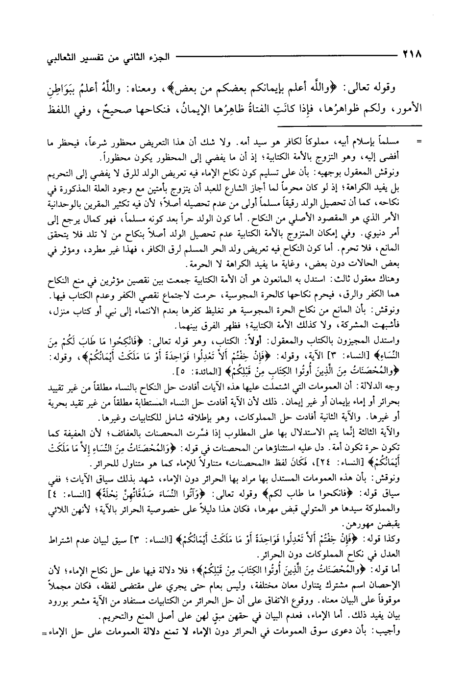 أما قوله: وَالْمُحْصَناتُ مِنَ الَّذِينَ أُوتُوا الْكِتابَ مِنْ قَبْلِكُمْ فلا دلالة فيها على حل نكاح الإماء لأن الإحصان اسم مشترك يتناول معان مختلفة، وليس بعام حتى يجري على مقتضى لفظه، فكان مجملا موقوفا على البيان معناه. ووقوع الاتفاق على أن حل الحرائر من الكتابيات مستفاد من الآية مشعر بورود بيان يفيد ذلك. أما الإماء، فعدم البيان في حقهن مبق لهن على أصل المنع والتحريم.
