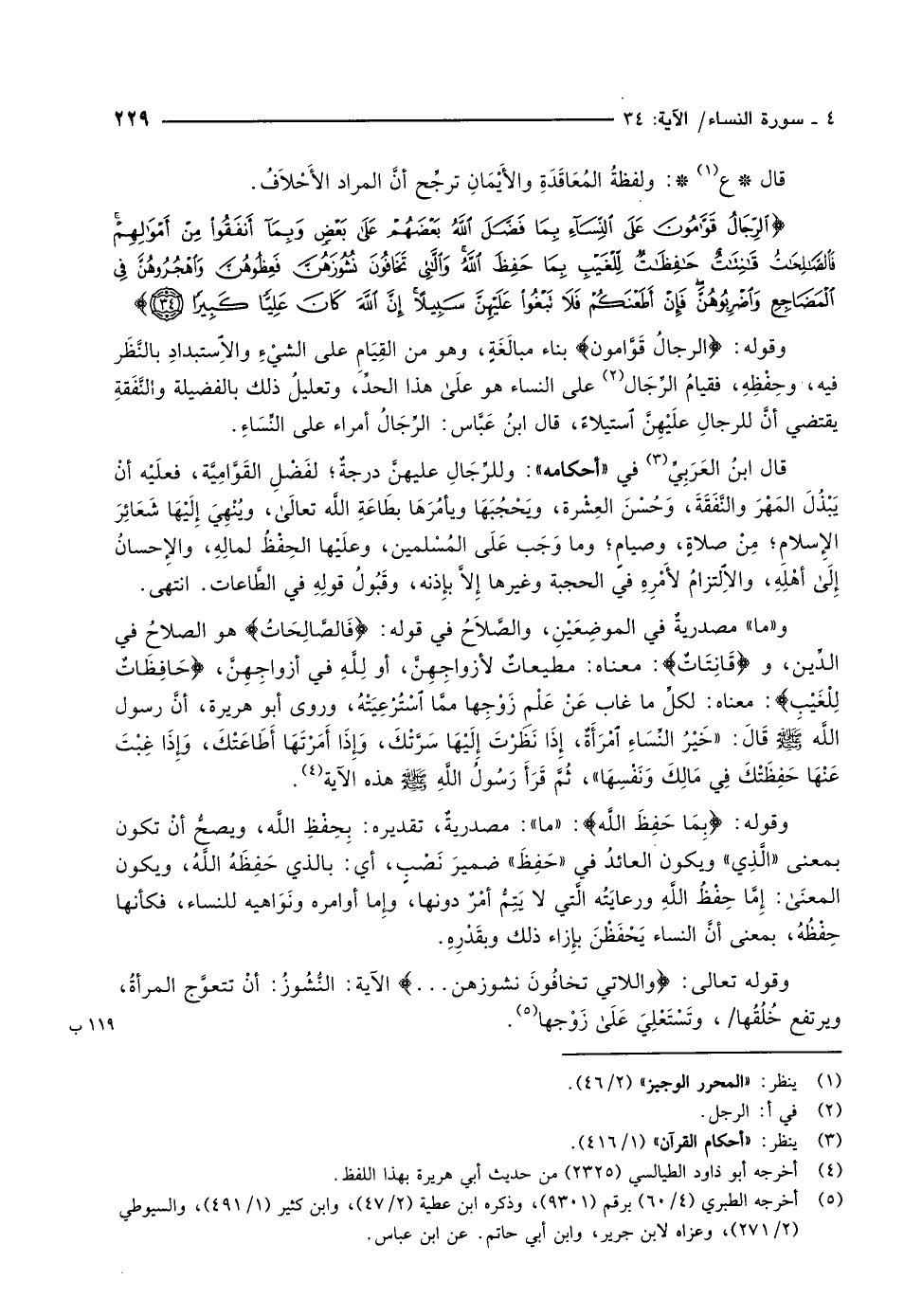 الرِّجالُ قَوَّامُونَ عَلَى النِّساءِ بِما فَضَّلَ اللَّهُ بَعْضَهُمْ عَلى بَعْضٍ وَبِما أَنْفَقُوا مِنْ أَمْوالِهِمْ فَالصَّالِحاتُ قانِتاتٌ حافِظاتٌ لِلْغَيْبِ بِما حَفِظَ اللَّهُ وَاللاَّتِي تَخافُونَ نُشُوزَهُنَّ فَعِظُوهُنَّ وَاهْجُرُوهُنَّ فِي الْمَضاجِعِ وَاضْرِبُوهُنَّ فَإِنْ أَطَعْنَكُمْ فَلا تَبْغُوا عَلَيْهِنَّ سَبِيلاً إِنَّ اللَّهَ كانَ عَلِيًّا كَبِيراً (34)