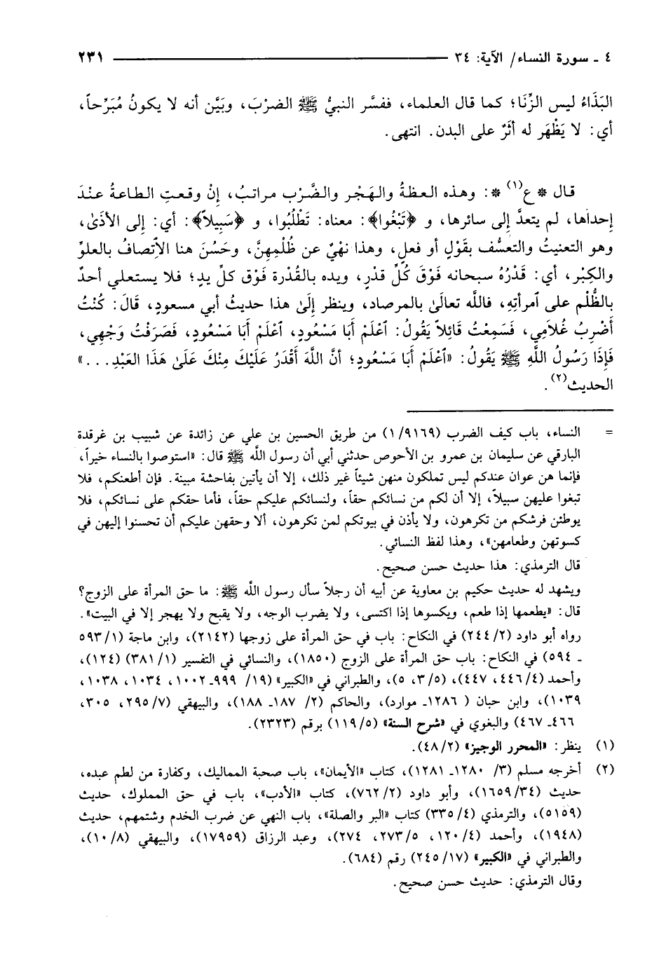 - النساء، باب كيف الضرب (9169/ 1) من طريق الحسين بن علي عن زائدة عن شبيب بن غرقدة البارقي عن سليمان بن عمرو بن الأحوص حدثني أبي أن رسول الله صلّى الله عليه وسلّم قال: «استوصوا بالنساء خيرا، فإنما هن عوان عندكم ليس تملكون منهن شيئا غير ذلك، إلا أن يأتين بفاحشة مبينة. فإن أطعنكم، فلا تبغوا عليهن سبيلا، إلا أن لكم من نسائكم حقا، ولنسائكم عليكم حقا، فأما حقكم على نسائكم، فلا يوطئن فرشكم من تكرهون، ولا يأذن في بيوتكم لمن تكرهون، ألا وحقهن عليكم أن تحسنوا إليهن في كسوتهن وطعامهن» ، وهذا لفظ النسائي.