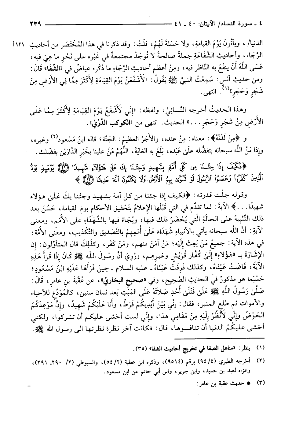 وقوله جلَّت قدرته: فَكَيْفَ إِذا جِئْنا مِنْ كُلِّ أُمَّةٍ بِشَهِيدٍ وَجِئْنا بِكَ عَلى هؤُلاءِ شَهِيداً ... الآيةَ: لما تقدَّم في التي قَبْلَها الإِعلامُ بتَحْقيق الأحكام يوم القيامة، حَسُنَ بعد ذلك التَّنْبِيهُ على الحالَةِ الَّتي يُحْضَرُ ذلك فيها، ويُجَاءُ فيها بالشُّهَدَاءِ على الأُمَمِ، ومعنى الآيةِ: أنَّ اللَّه سبحانه يأتي بالأنبياءِ شُهَدَاءَ عَلَى أُمَمِهِمْ بالتَّصْديق والتَّكْذيب، ومعنى الأُمَّة في هذه الآية: جميعُ مَنْ بُعِثَ إِلَيْه مَنْ آمَنَ منهم، ومَنْ كَفَر، وكذَلِكَ قال المتأوِّلون: إن الإشارة ب «هؤلاء» إلى كفّار قريش وغيرهم، وروي أنّ رسول الله صلّى الله عليه وسلّم كَانَ إِذَا قَرَأَ هَذِهِ الآيَةَ، فَاضَتْ عَيْنَاهُ، وكذلك ذَرِفَتْ عَيْنَاهُ- عليه السلام- حِينَ قَرَأَهَا عليه ابْنُ مَسْعُودٍ حَسْبَما هو مذكورٌ في الحديثِ الصَّحِيح، وفي «صحيحِ البخاريِّ» ، عن عُقْبَةَ بنِ عامر، قال: