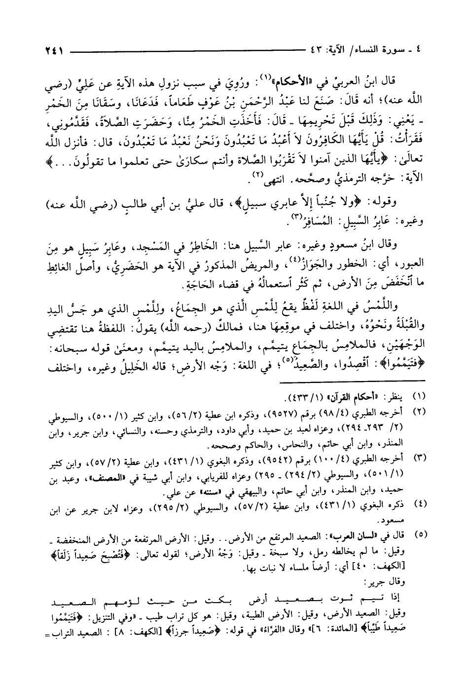 وقوله: وَلا جُنُباً إِلَّا عابِرِي سَبِيلٍ، قال عليُّ بن أبي طالب (رضي اللَّه عنه) وغيره: عَابِرُ السَّبِيلِ: المُسَافِرُ «3» .