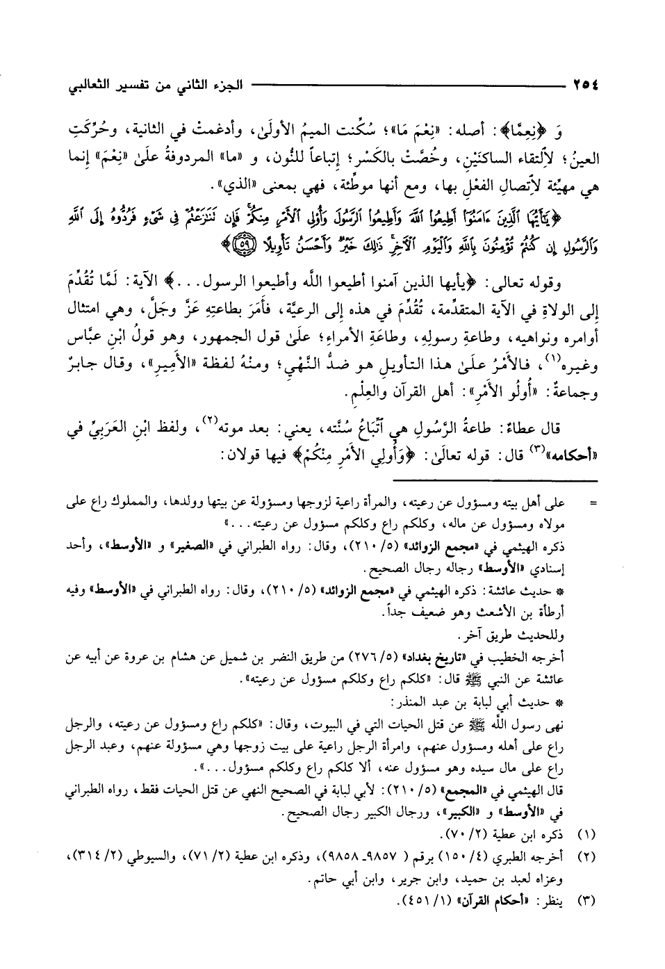 قال عطاءٌ: طاعةُ الرَّسُولِ هي اتباع سُنَّته، يعني: بعد موته «2» ، ولفظ ابْنِ العَرَبِيِّ في «أحكامه» «3» قال: قوله تعالى: وَأُولِي الْأَمْرِ مِنْكُمْ فيها قولان: