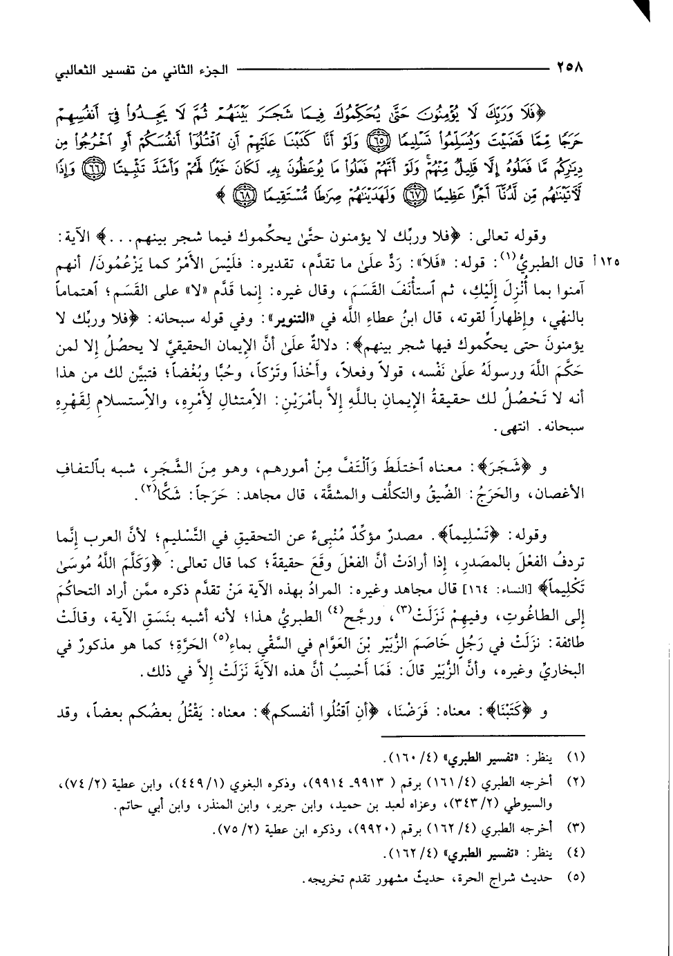 وقوله: تَسْلِيماً. مصدرٌ مؤكِّدٌ مُنْبِىءٌ عن التحقيقِ في التَّسْليمِ لأنَّ العرب إنَّما تردفُ الفعْلَ بالمصَدرِ، إذا أرادَتْ أنَّ الفعْلَ وقَعَ حقيقةً كما قال تعالى: وَكَلَّمَ اللَّهُ مُوسى تَكْلِيماً [النساء: 164] قال مجاهد وغيره: المرادُ بهذه الآية مَنْ تقدَّم ذكره ممَّن أراد التحاكُمَ إلى الطاغُوتِ، وفيهِمْ نَزَلَتْ «3» ، ورجَّح «4» الطبريُّ هذا لأنه أشبه بنَسَقِ الآية، وقالَتْ طائفة: نزَلَتْ في رَجُلٍ خَاصَمَ الزُّبَيْر بْنَ العَوَّام في السَّقْيِ بماءِ «5» الحَرَّةِ كما هو مذكورٌ في البخاريِّ وغيره، وأنَّ الزُّبَيْر قالَ: فَمَا أَحْسِبُ أنَّ هذه الآيةَ نزلت إلّا في ذلك.