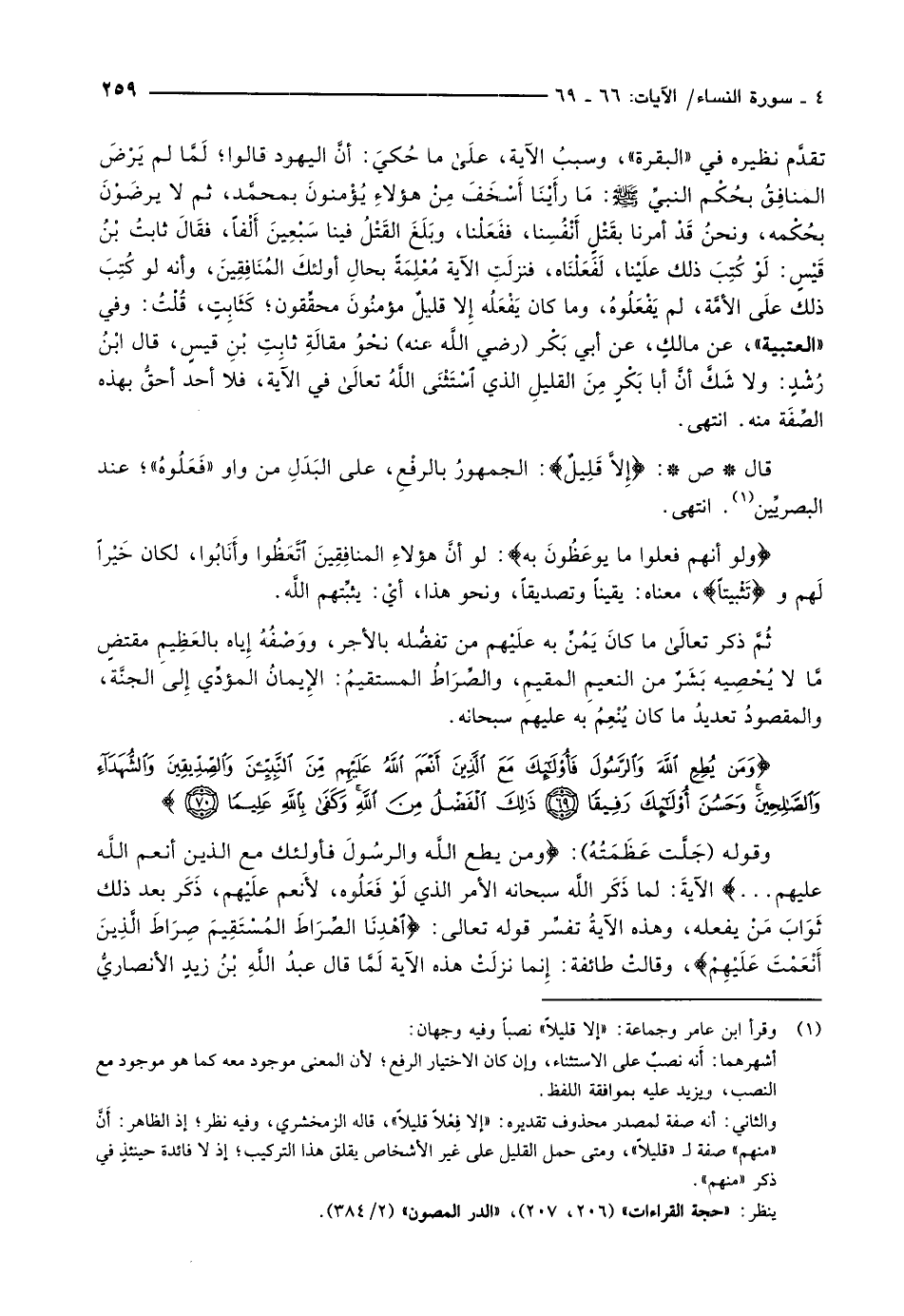 والثاني: أنه صفة لمصدر محذوف تقديره: «إلا فعلا قليلا» ، قاله الزمخشري، وفيه نظر إذ الظاهر: أنّ «منهم» صفة ل «قليلا» ، ومتى حمل القليل على غير الأشخاص يقلق هذا التركيب إذ لا فائدة حينئذ في ذكر «منهم» .