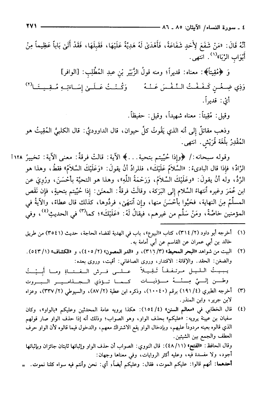 وقوله سبحانه: وَإِذا حُيِّيتُمْ بِتَحِيَّةٍ ... الآية: قالتْ فرقةٌ: معنى الآية: تخييرُ الرَّادِّ فإذا قال البادئ: «السَّلاَمُ عَلَيْكَ» ، فللرادِّ أنْ يقولَ: «وَعَلَيْكَ السَّلاَمُ» فقطْ، وهذا هو الرَّدُّ، وله أنْ يقولَ: «وعَلَيْكَ السَّلاَمُ، وَرَحْمَةُ اللَّهِ» ، وهذا هو التحيَّة بأحْسَنَ، ورُوِيَ عن ابن عُمَرَ وغيره انتهاء السَّلام إلى البَرَكة، وقالَتْ فرقةٌ: المعنى: إذا حُيِّيتم بتحيةٍ، فإن نَقَص المسلِّمُ مِنَ النهاية، فحَيُّوا بأحْسَنَ منها، وإن انتهى، فردُّوها، كذلك قال عطاءٌ، والآيةُ في المؤمنين خاصَّةً، ومَنْ سَلَّم من غيرهم، فيقالُ لَهُ: «عَلَيْكَ» كما»