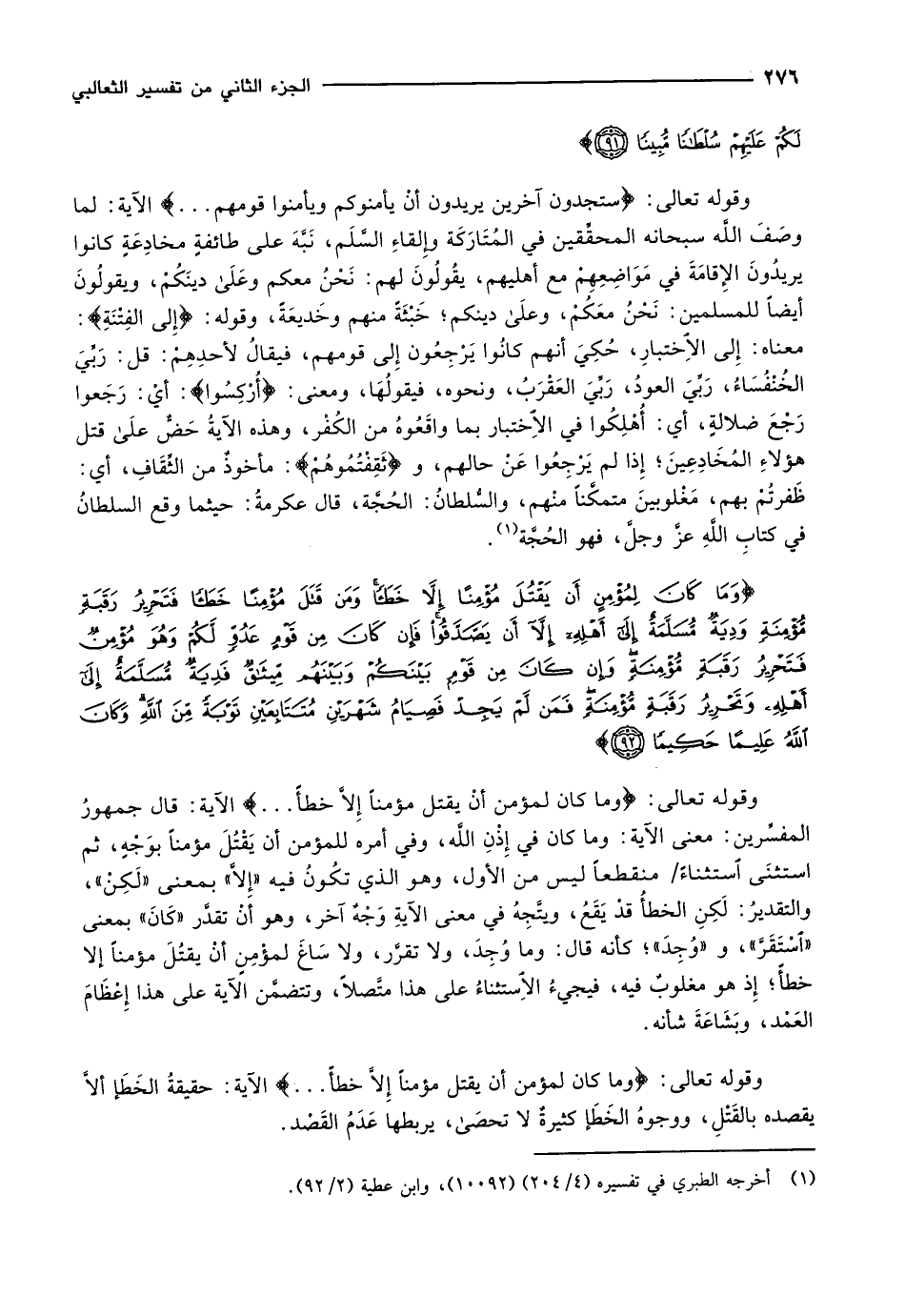 وَما كانَ لِمُؤْمِنٍ أَنْ يَقْتُلَ مُؤْمِناً إِلاَّ خَطَأً وَمَنْ قَتَلَ مُؤْمِناً خَطَأً فَتَحْرِيرُ رَقَبَةٍ مُؤْمِنَةٍ وَدِيَةٌ مُسَلَّمَةٌ إِلى أَهْلِهِ إِلاَّ أَنْ يَصَّدَّقُوا فَإِنْ كانَ مِنْ قَوْمٍ عَدُوٍّ لَكُمْ وَهُوَ مُؤْمِنٌ فَتَحْرِيرُ رَقَبَةٍ مُؤْمِنَةٍ وَإِنْ كانَ مِنْ قَوْمٍ بَيْنَكُمْ وَبَيْنَهُمْ مِيثاقٌ فَدِيَةٌ مُسَلَّمَةٌ إِلى أَهْلِهِ وَتَحْرِيرُ رَقَبَةٍ مُؤْمِنَةٍ فَمَنْ لَمْ يَجِدْ فَصِيامُ شَهْرَيْنِ مُتَتابِعَيْنِ تَوْبَةً مِنَ اللَّهِ وَكانَ اللَّهُ عَلِيماً حَكِيماً (92)