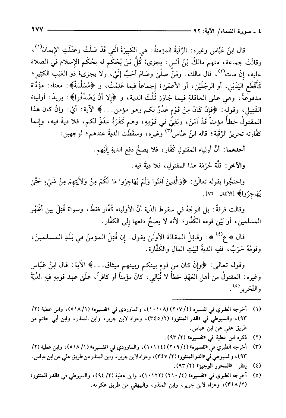 قال ع «4» : وقائِلُ المقالة الأولى يقول: إن قُتِلَ المؤمنُ في بَلَدِ المسلمينَ، وقومُهُ حَرْبٌ، ففيه الديةُ لبَيْتِ المالِ والكَفَّارة.
